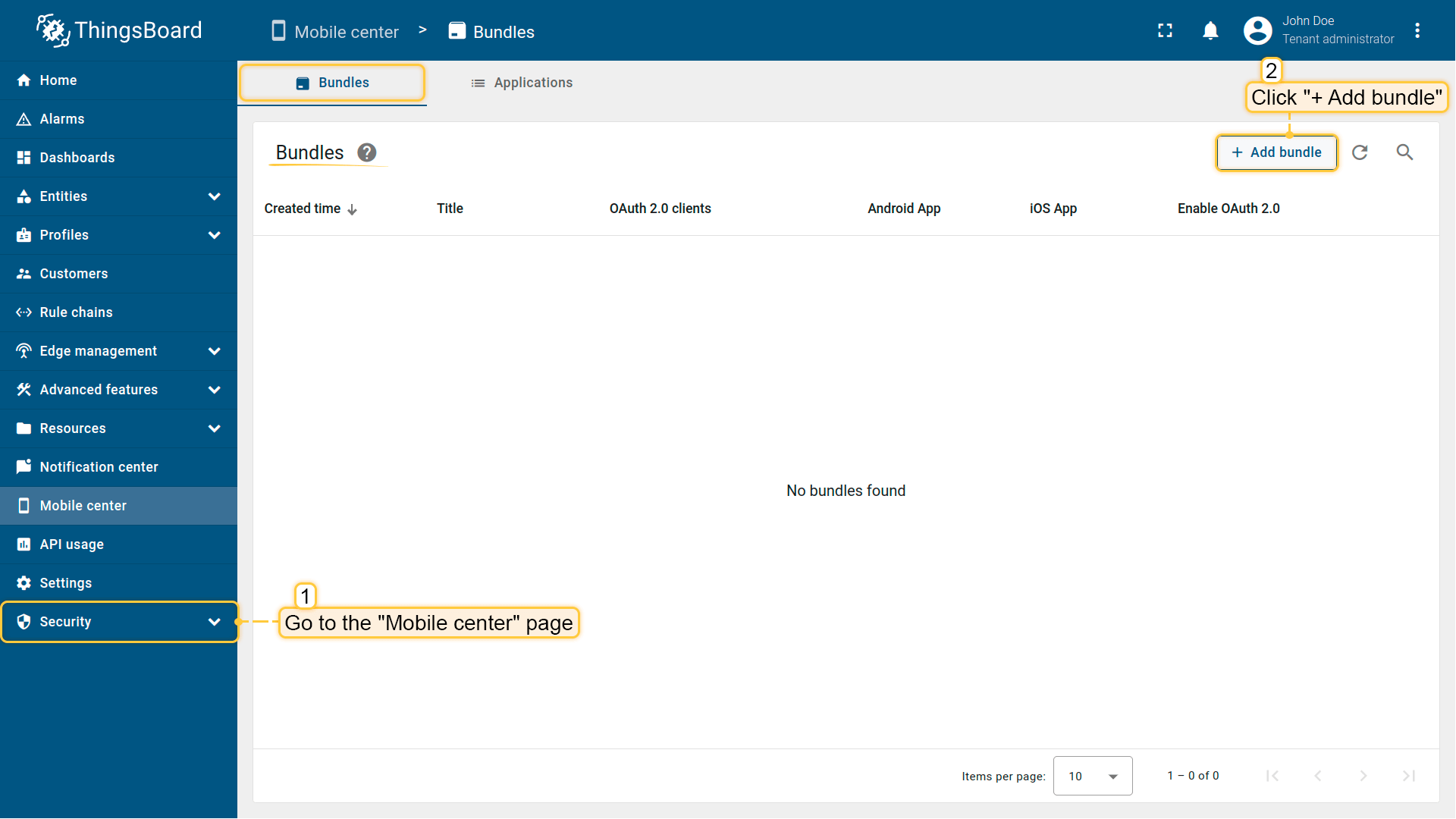 To add a new bundle, navigate to the “Mobile center” page and, on the “Bundle” tab, click the “+ Add bundle” button in the upper-right corner of the window.
