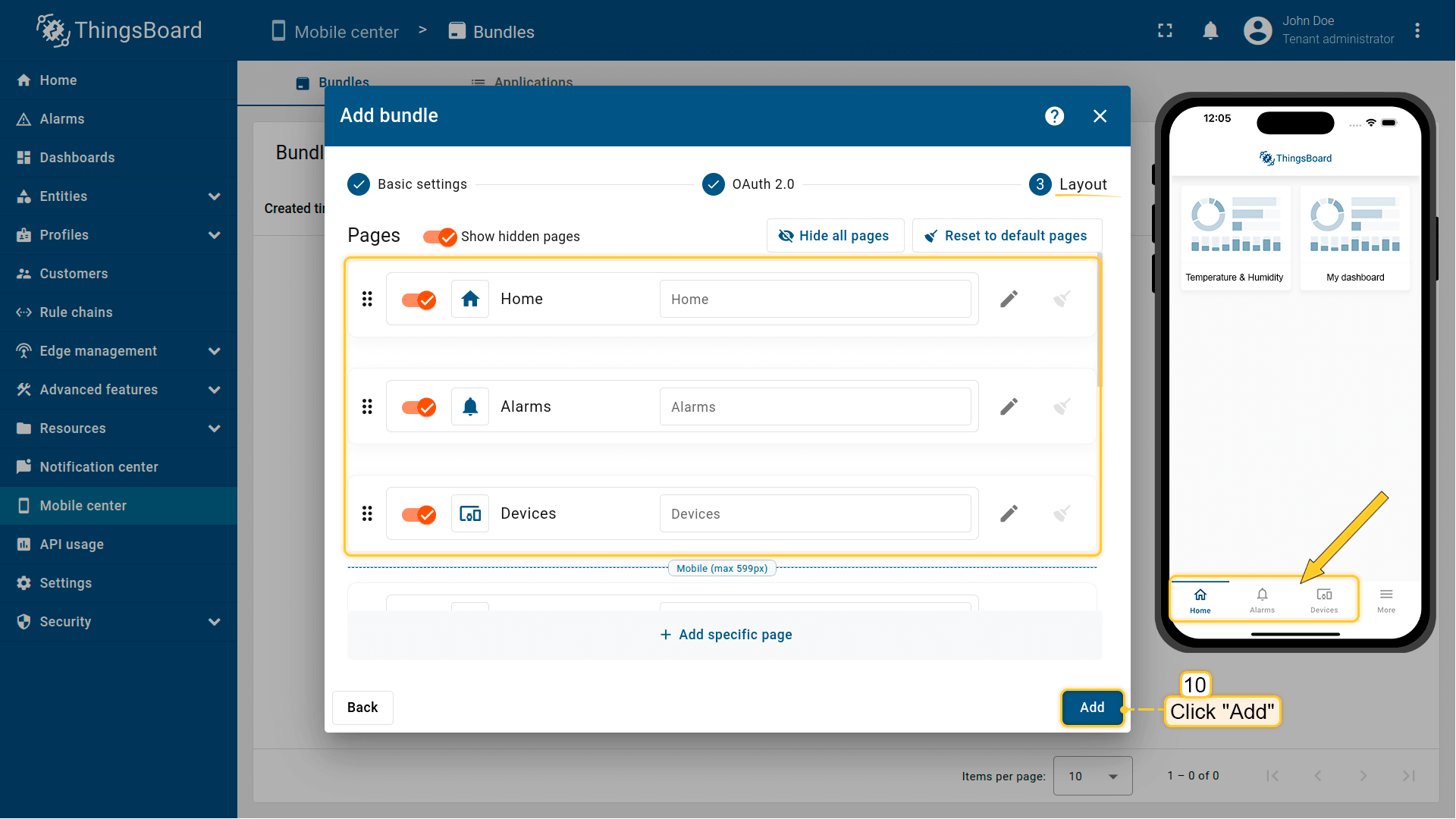 Configure the layout for quick access to the features and dashboards you use most often. Add new menu items, customize icons and labels, and reorganize the navigation menu of the IoT Hub mobile app to fit your needs. Click “Add” to finalize adding the bundle.