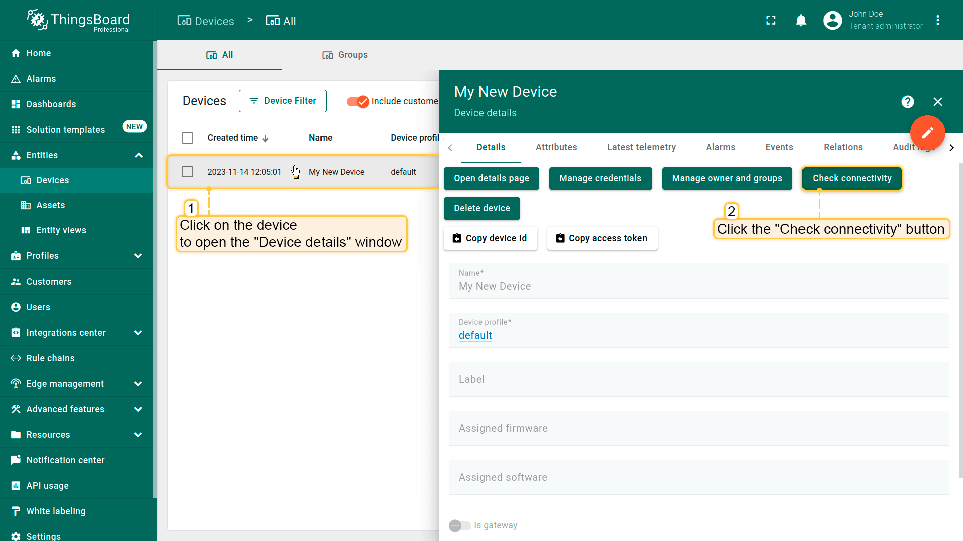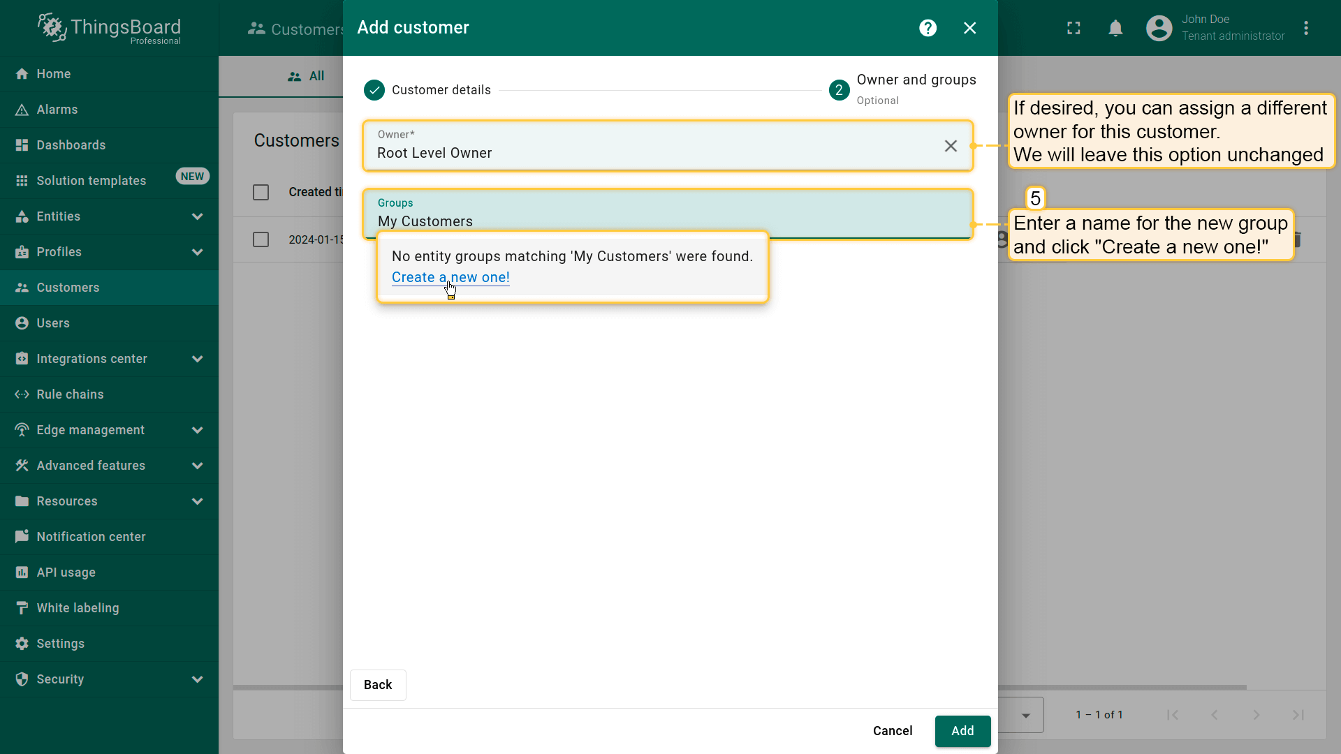 - A. Assign the Customer as the owner of the entity. This option is useful to ensure that only this customer can access the device and its data (see Step 7.2).