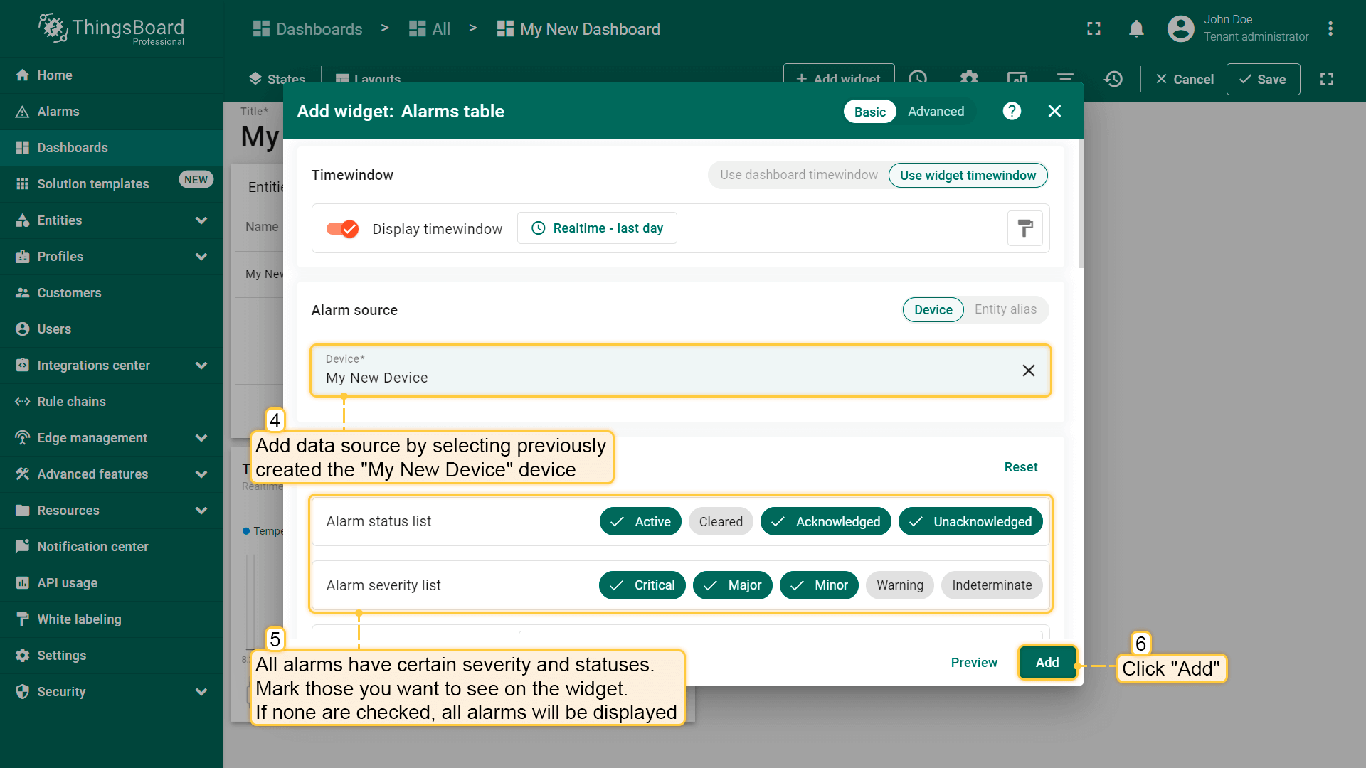 - Specify the previously created device "My New Device" as the data source in the "Device" field. Next, we will configure the filters. All alarms have specific severities and statuses. Mark those you want to see in the widget. If none are marked, all alarms will be displayed regardless of their status or severity;