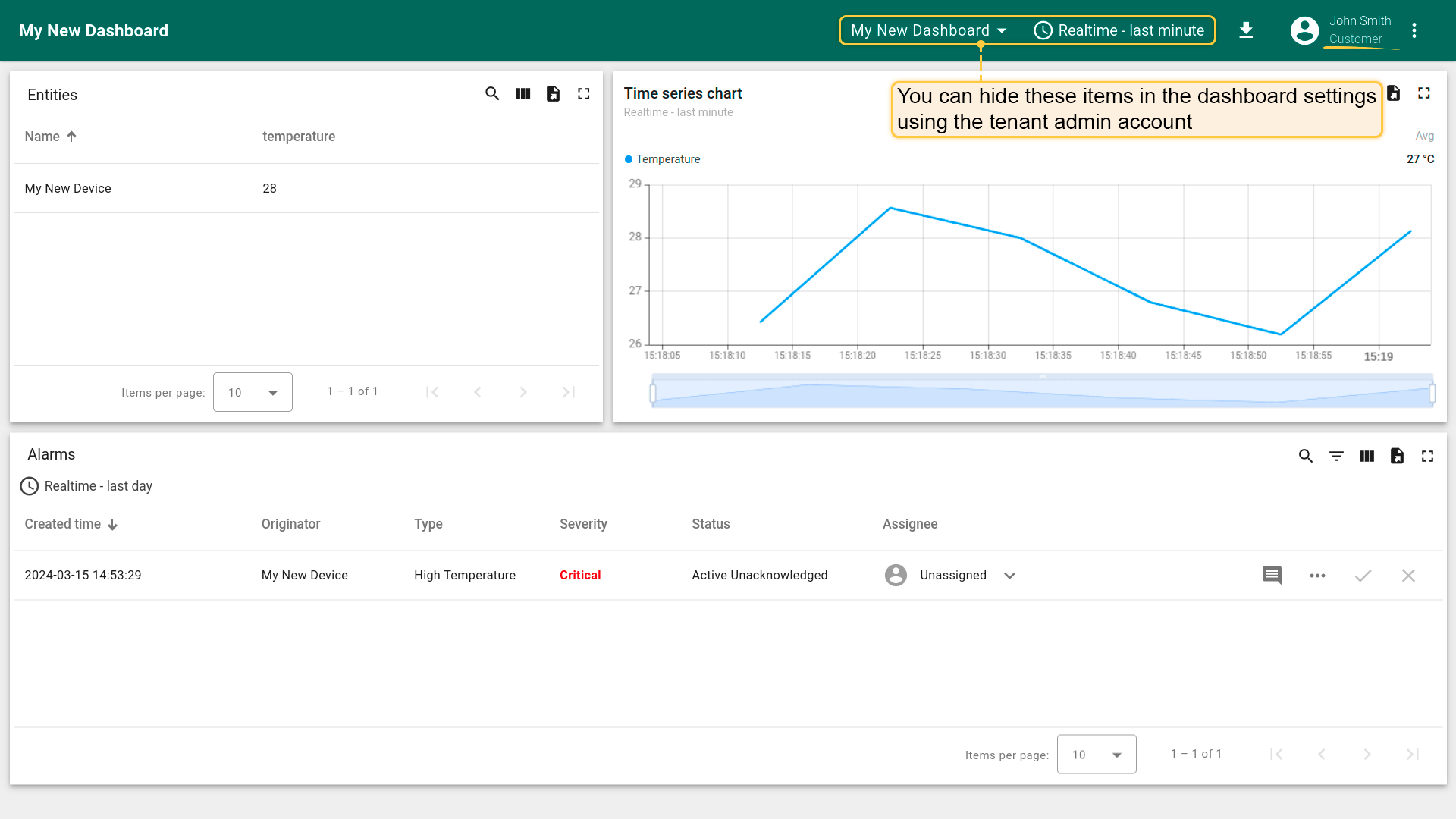 One of the most important IoT Hub features is the ability to create end-user dashboards. Each Customer User should see his own devices and should not be able to see devices or any other data that belongs to a different customer.