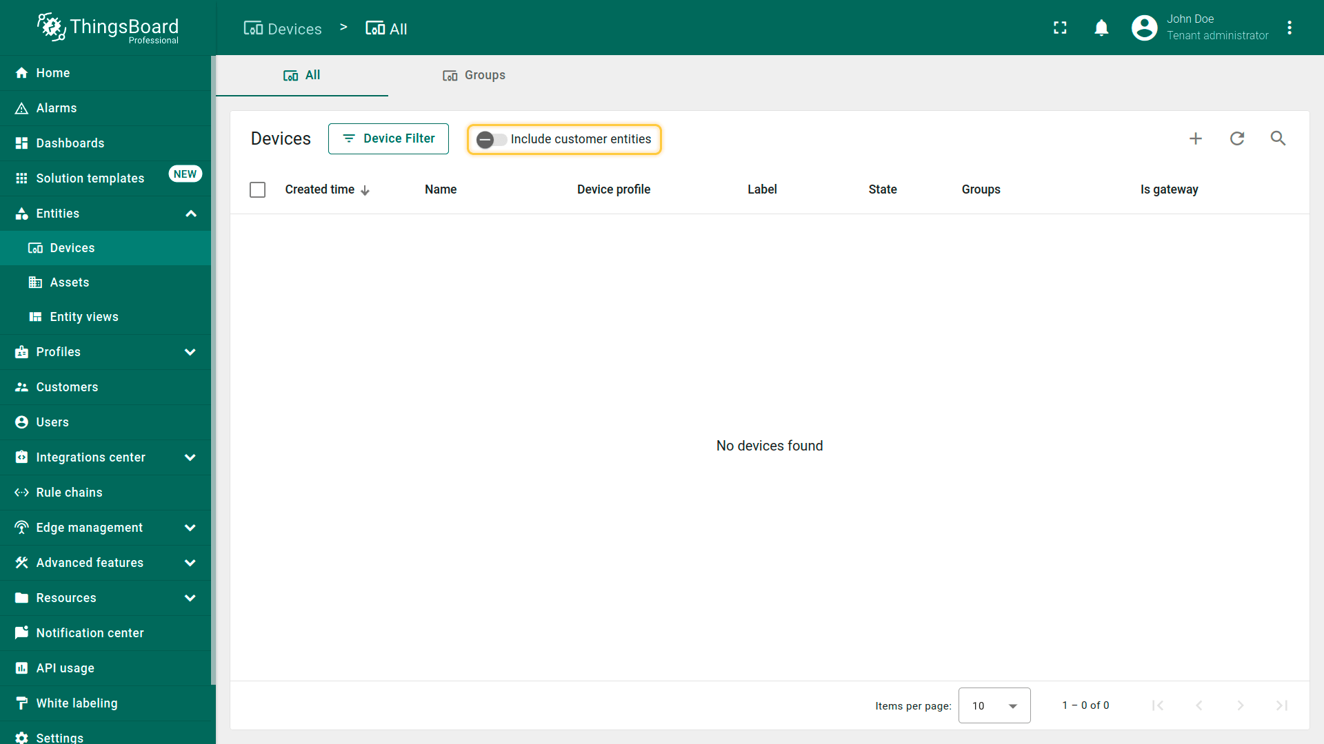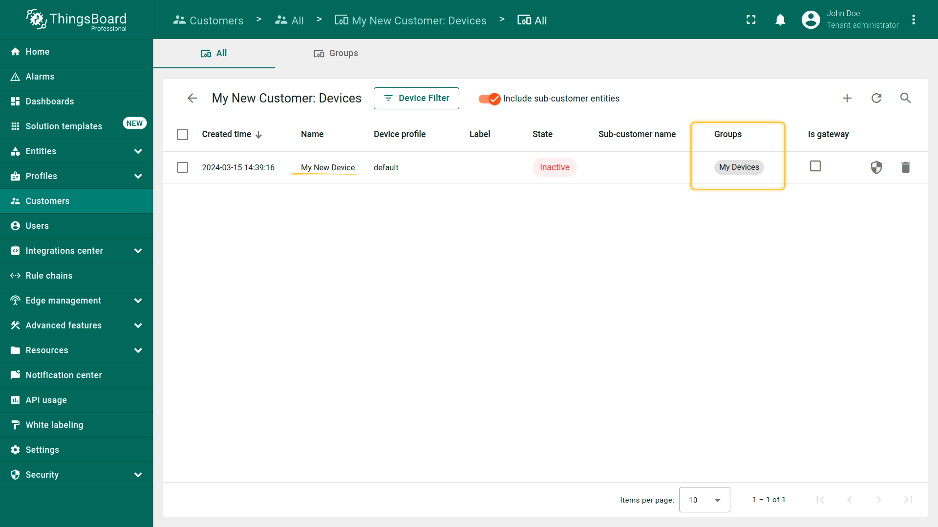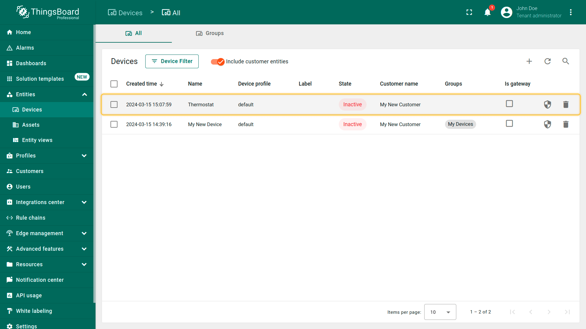 - By default, the general device list displays both tenant devices and devices of your customers. Disable "Include customer entities" to only see tenant devices in the device list;