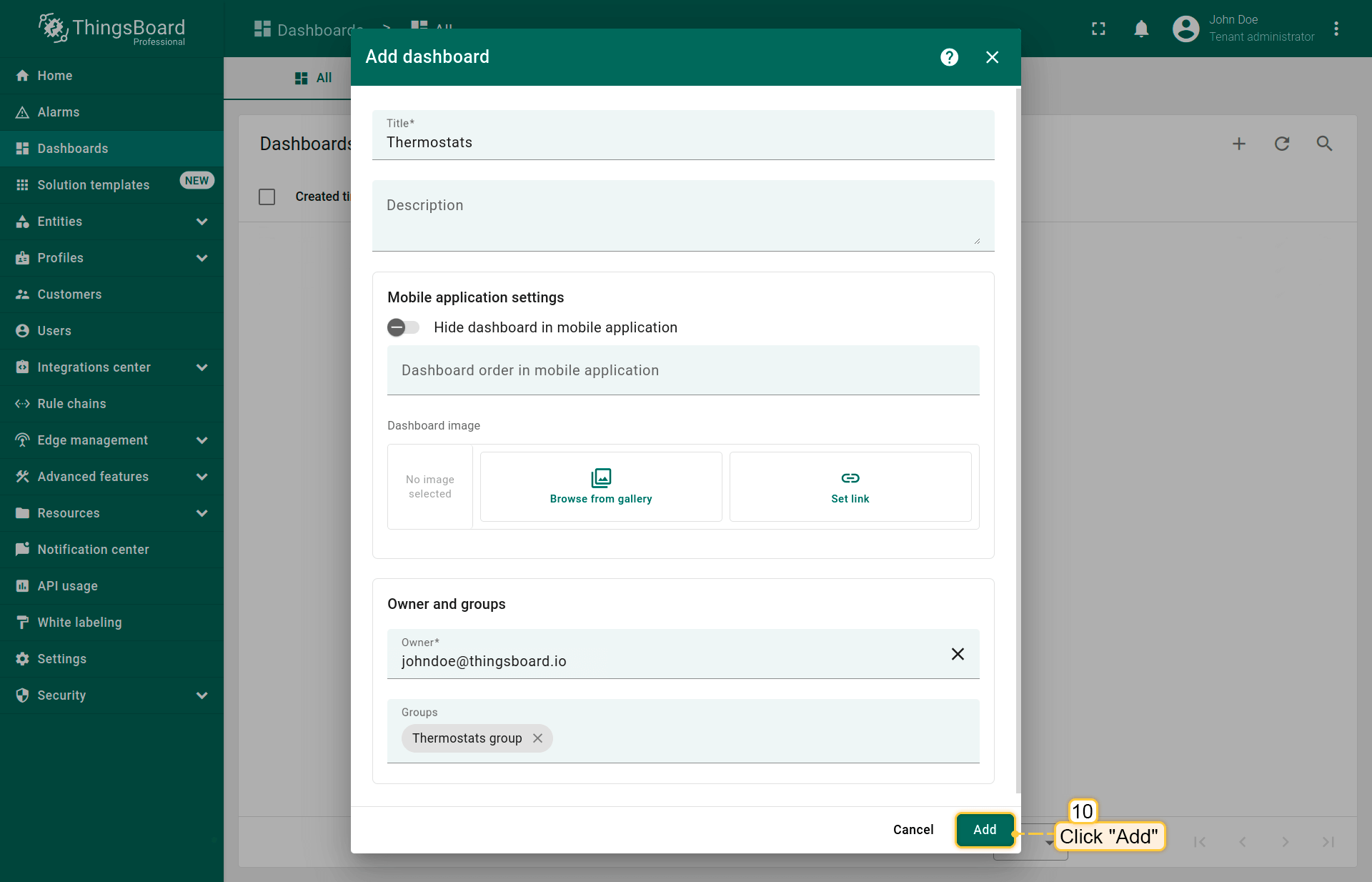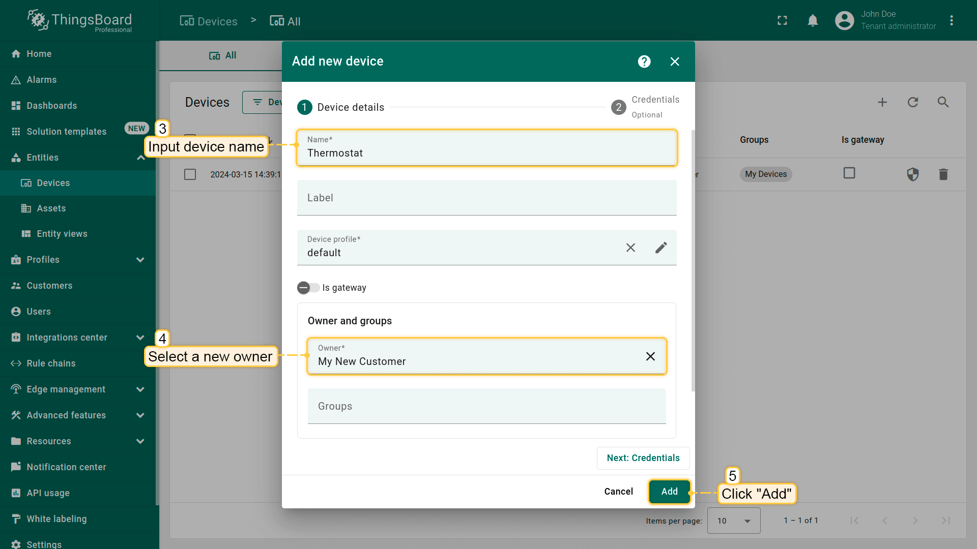 - Input device name (for example, "Thermostat") and select the new owner in the "Owner" field. Then, click "Add";