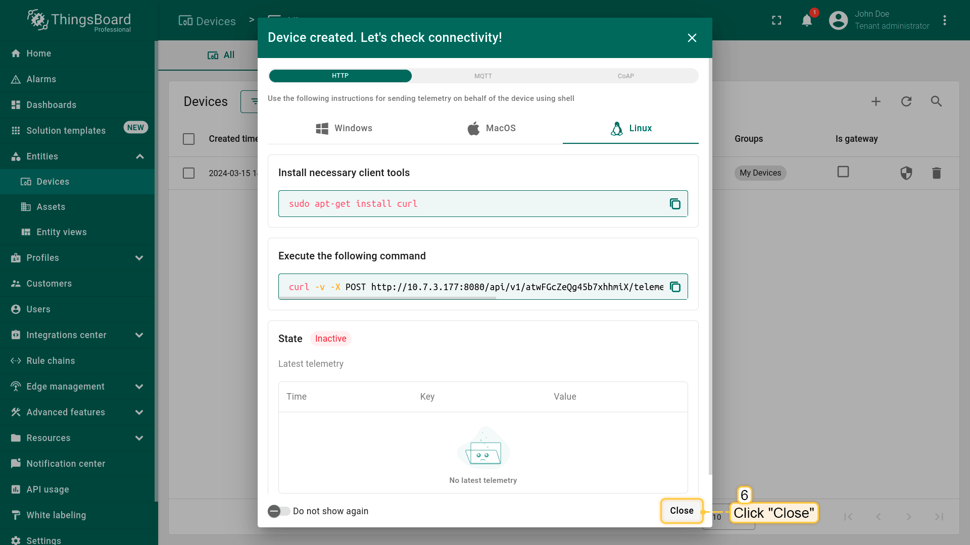 - The device has been created, and it immediately belongs to your customer.