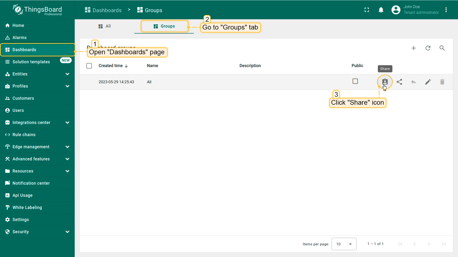 - Open the "Dashboards" page and go to the "Groups" tab. Click the "Share" icon next to the "All" dashboard group;