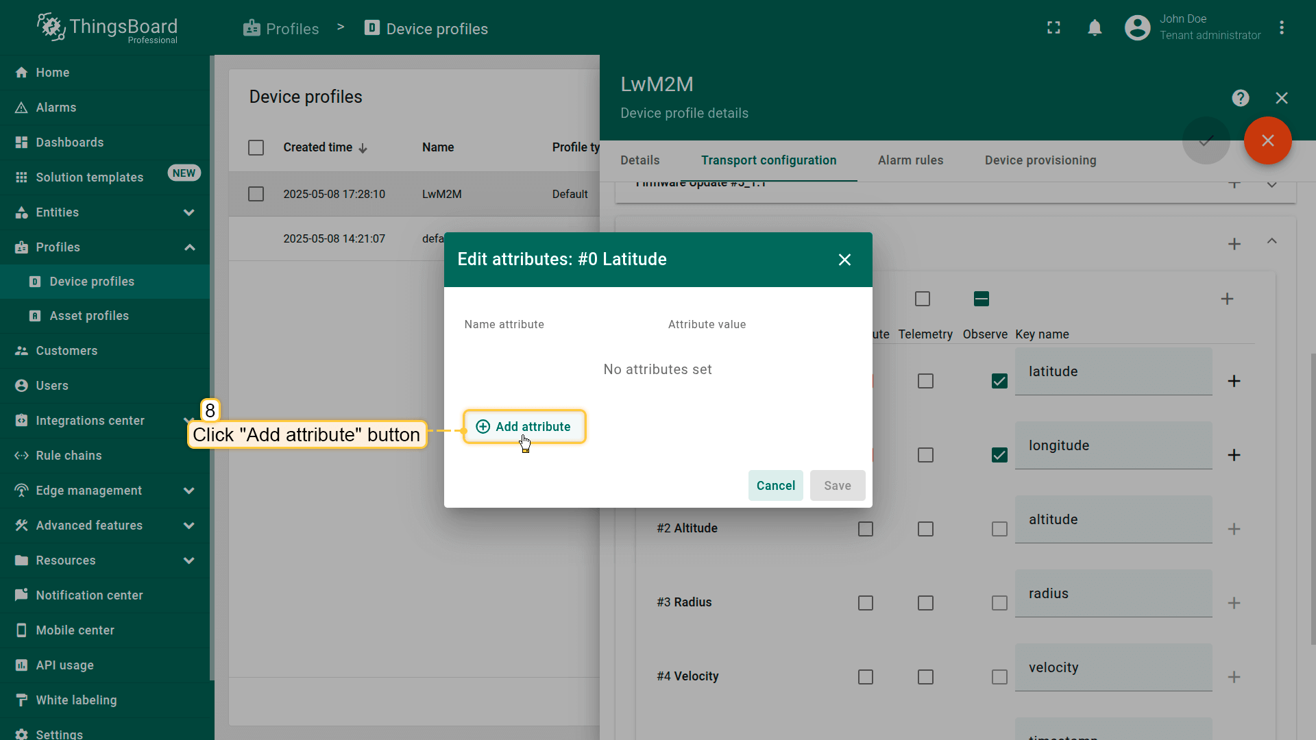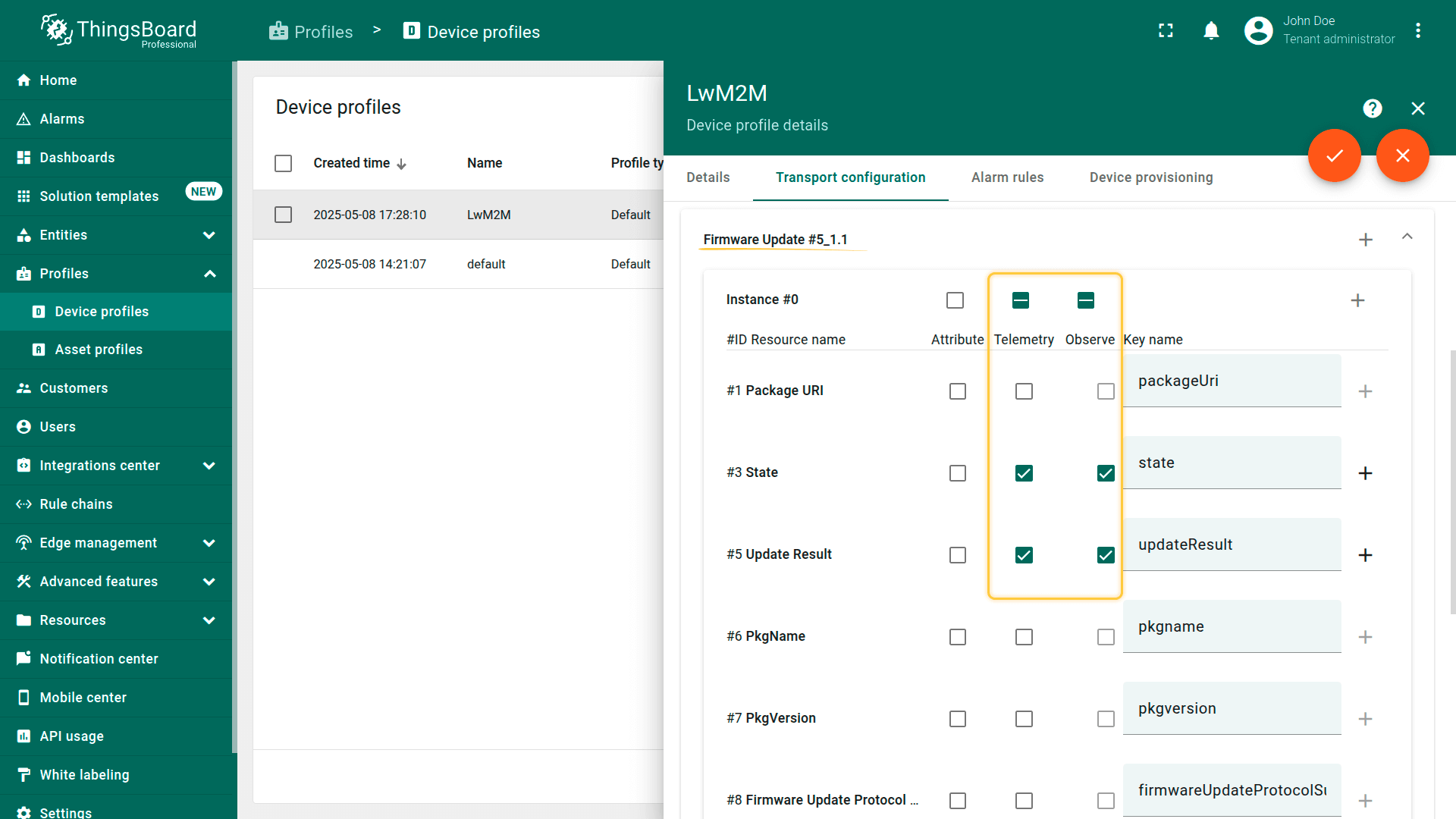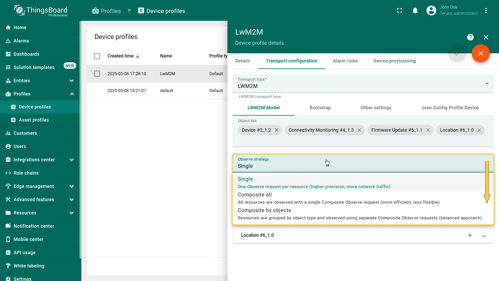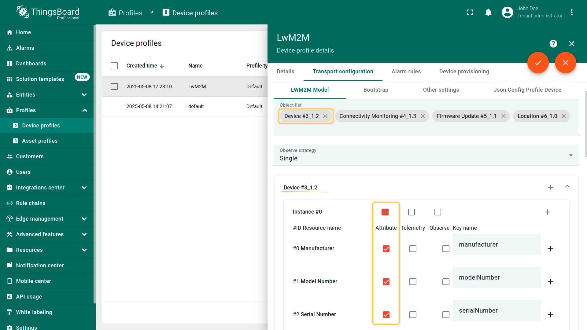 During LwM2M client registration, the initialization procedure is triggered as defined in the profile configuration: Read (Attributes and/or Telemetry), and Observe of those fields. If the ObjectVersion in the profile differs from the ObjectVersion sent by the LwM2M client during registration, all initialization operations for that object will be rejected.