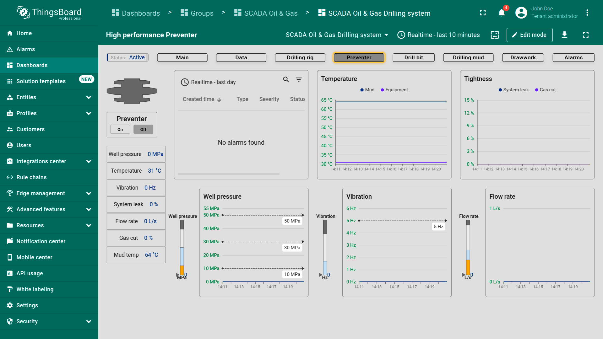 As part of this solution, we have developed a comprehensive SCADA Oil & Gas Drilling system dashboard, providing real-time monitoring and control of key drilling parameters such as rotary speed, depth, tension, and fluid flow rate. Operators can manage equipment (pump, rotor, preventer), analyze the condition of the drilling rig, drill bit, and drilling mud, and track load and vibration levels. The system features interactive graphs, alarm logs, and notifications, helping to prevent accidents and enhance operational efficiency.