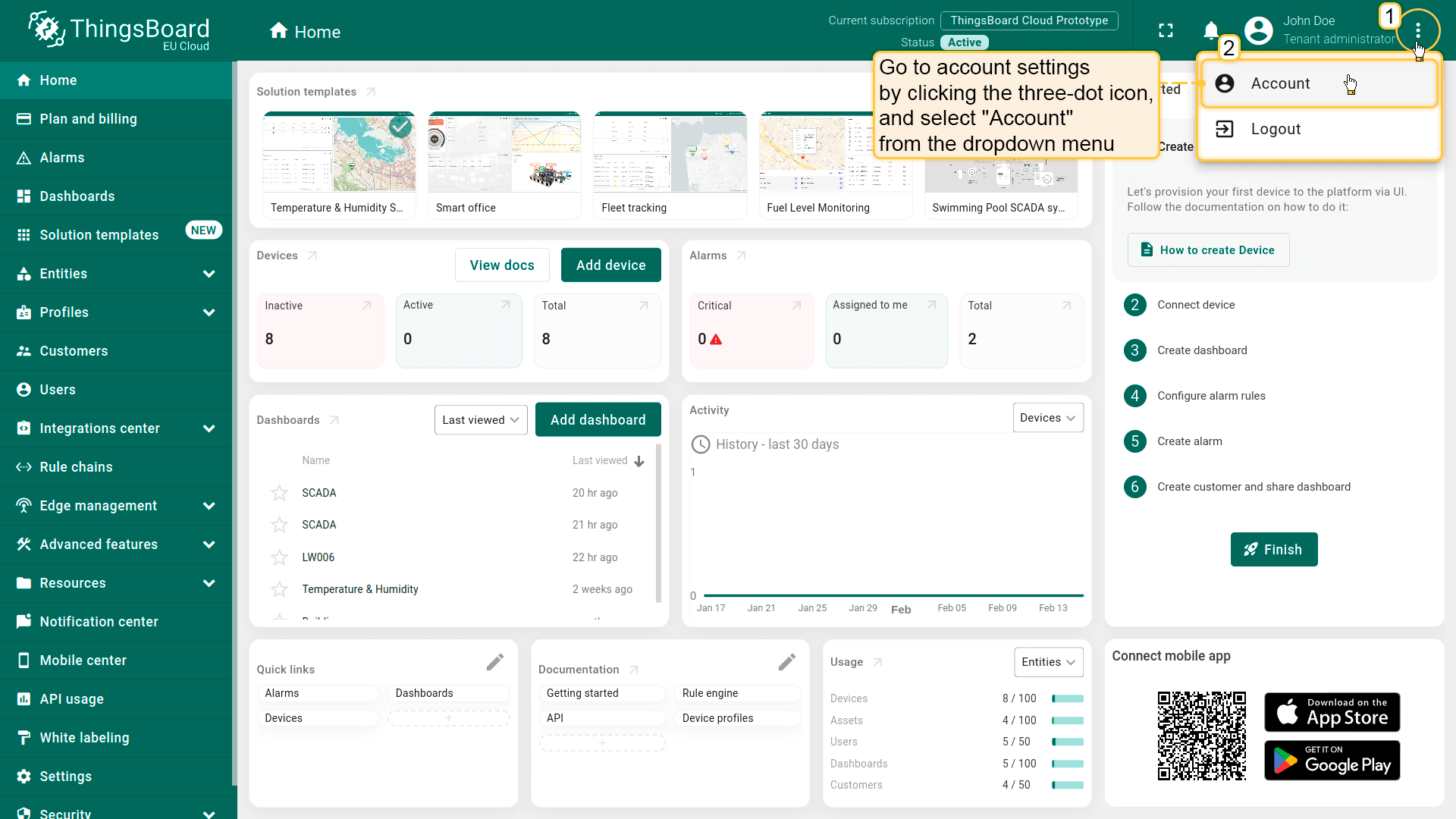 ThingsBoars Cloud provides subscription plans based on the pay-as-you-go model. Main characteristics of the subscription plan are: entity limits, api limits, white labeling and the level of support you get.