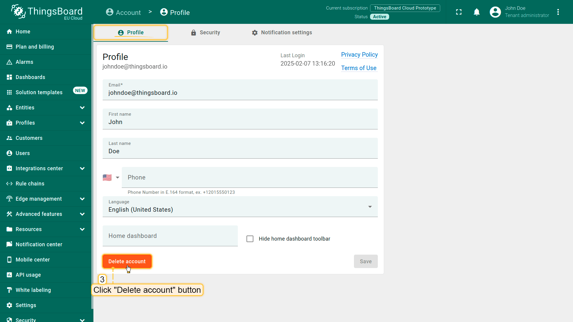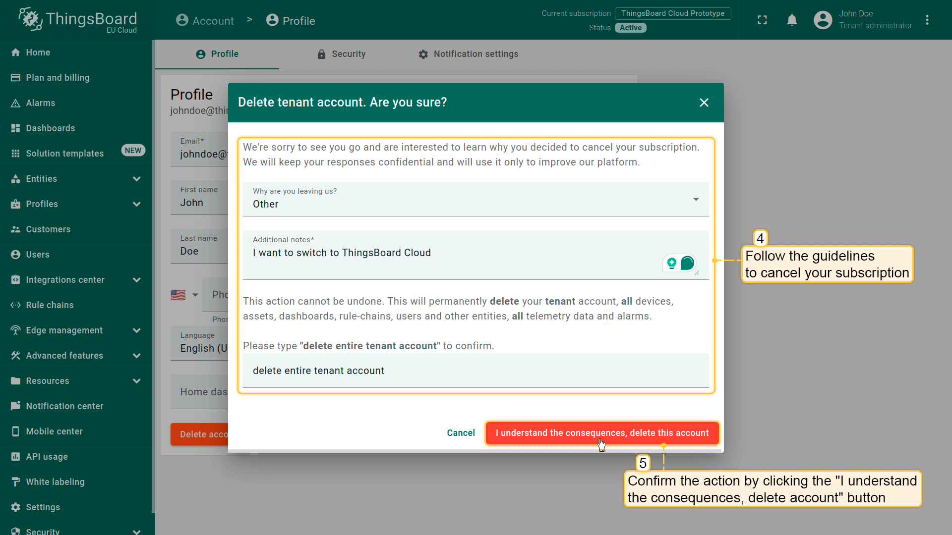 - Confirm the action by clicking the “I understand the consequences, delete account” button.