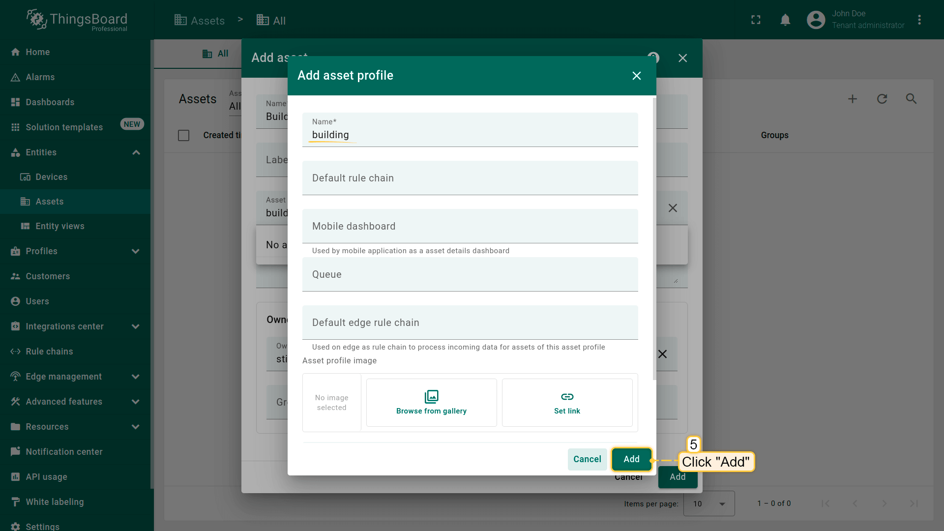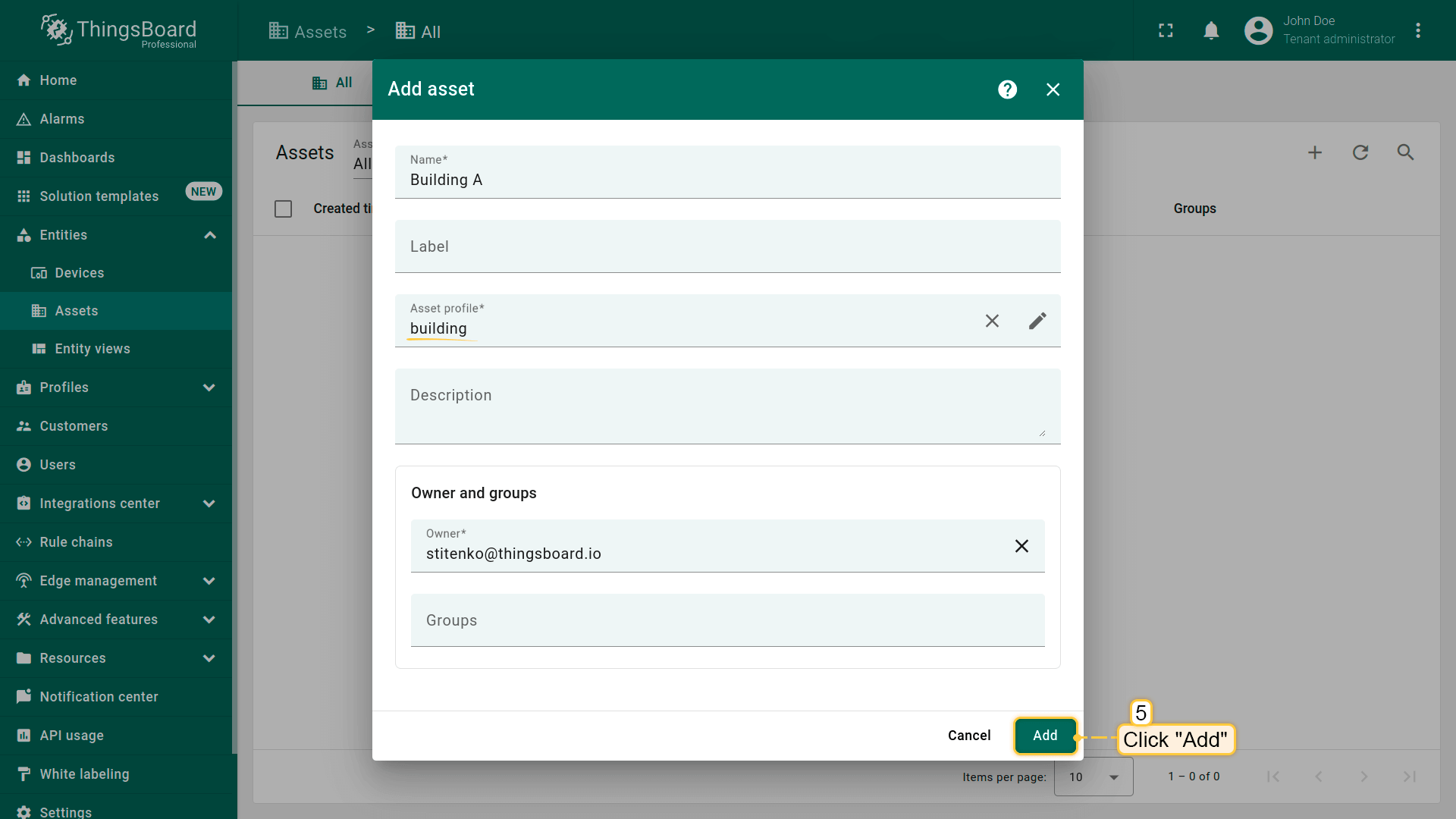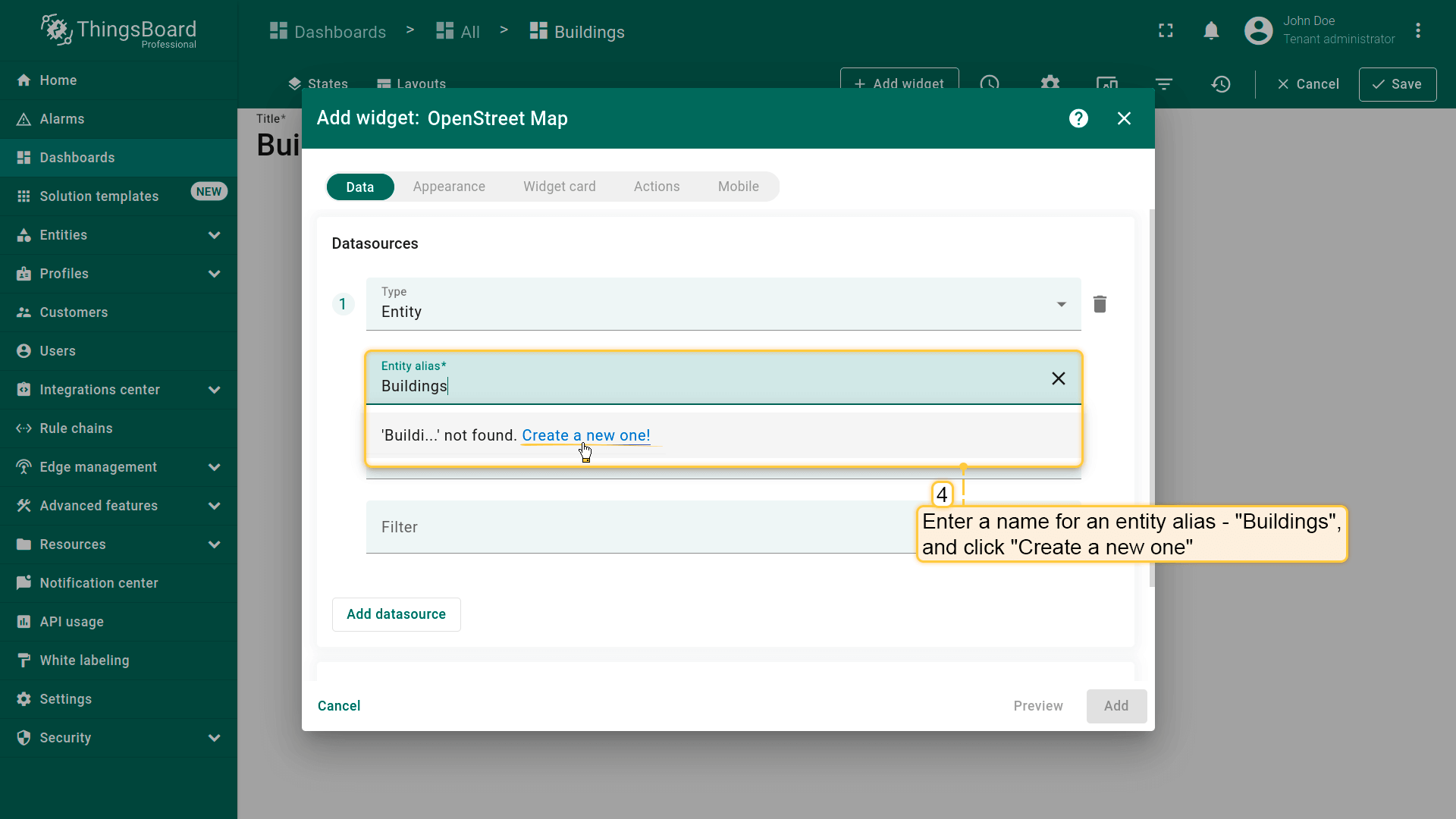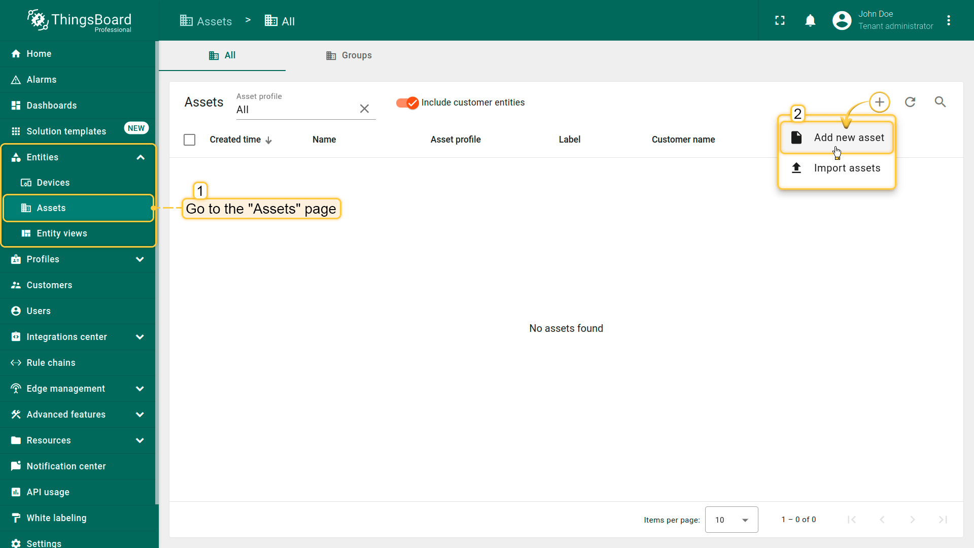 Before we add and configure the dashboard, we need to add some entities, specifically assets and devices. Assets will represent our buildings and offices, while devices will represent our sensors.