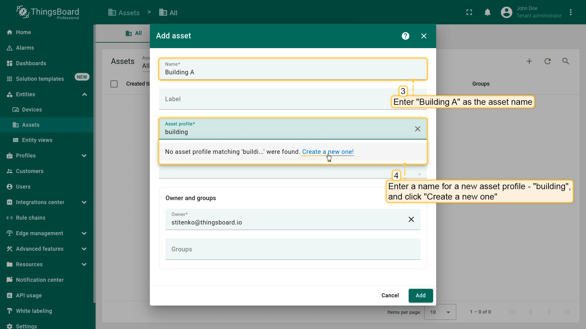 - In the asset name field, type “Building A”. Type “building” in the “Asset profile” section and click on “Create a new one!” to establish a new profile for this asset;