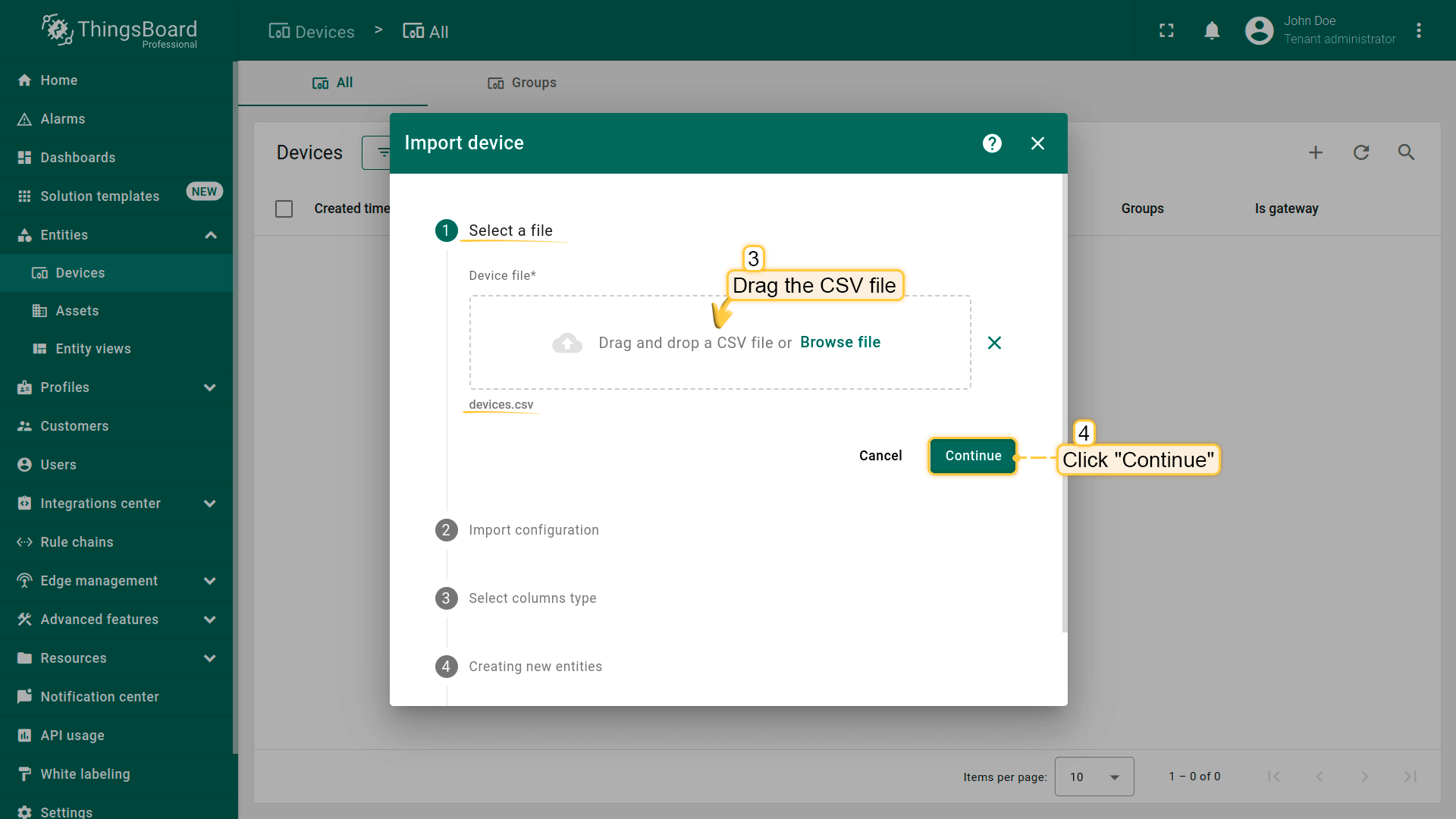 - Create a CSV file or download a pre-made one, where each row corresponds to the creation of a single device with specified parameters: