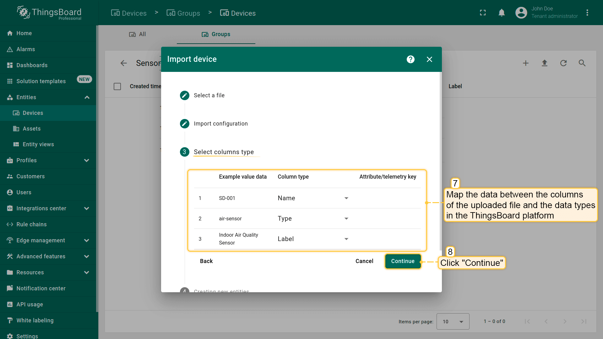 - Map the data between the columns of the uploaded file and the data types in the IoT Hub platform. Click “Continue” and then click “OK”.