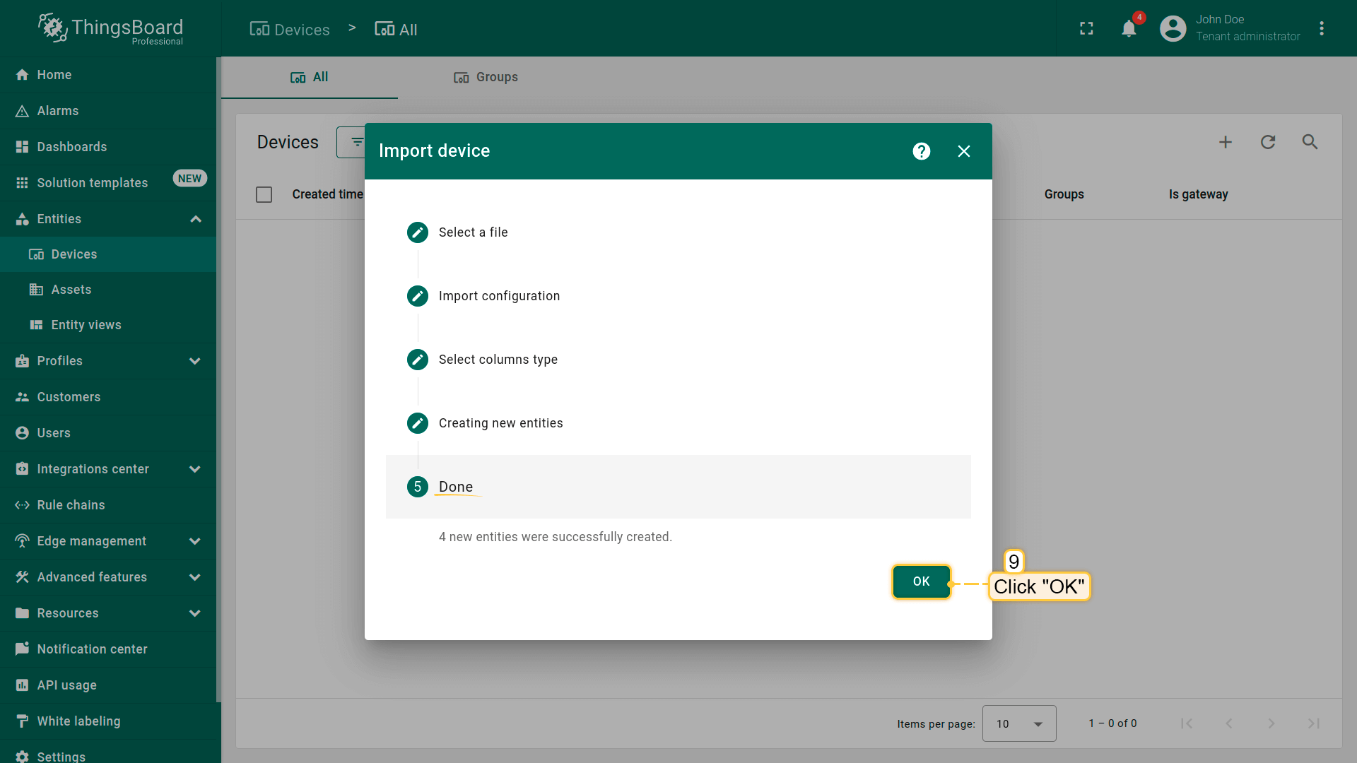 - Click the “plus” icon located in the top-right corner of the table. Select “Import device” from the drop-down menu;