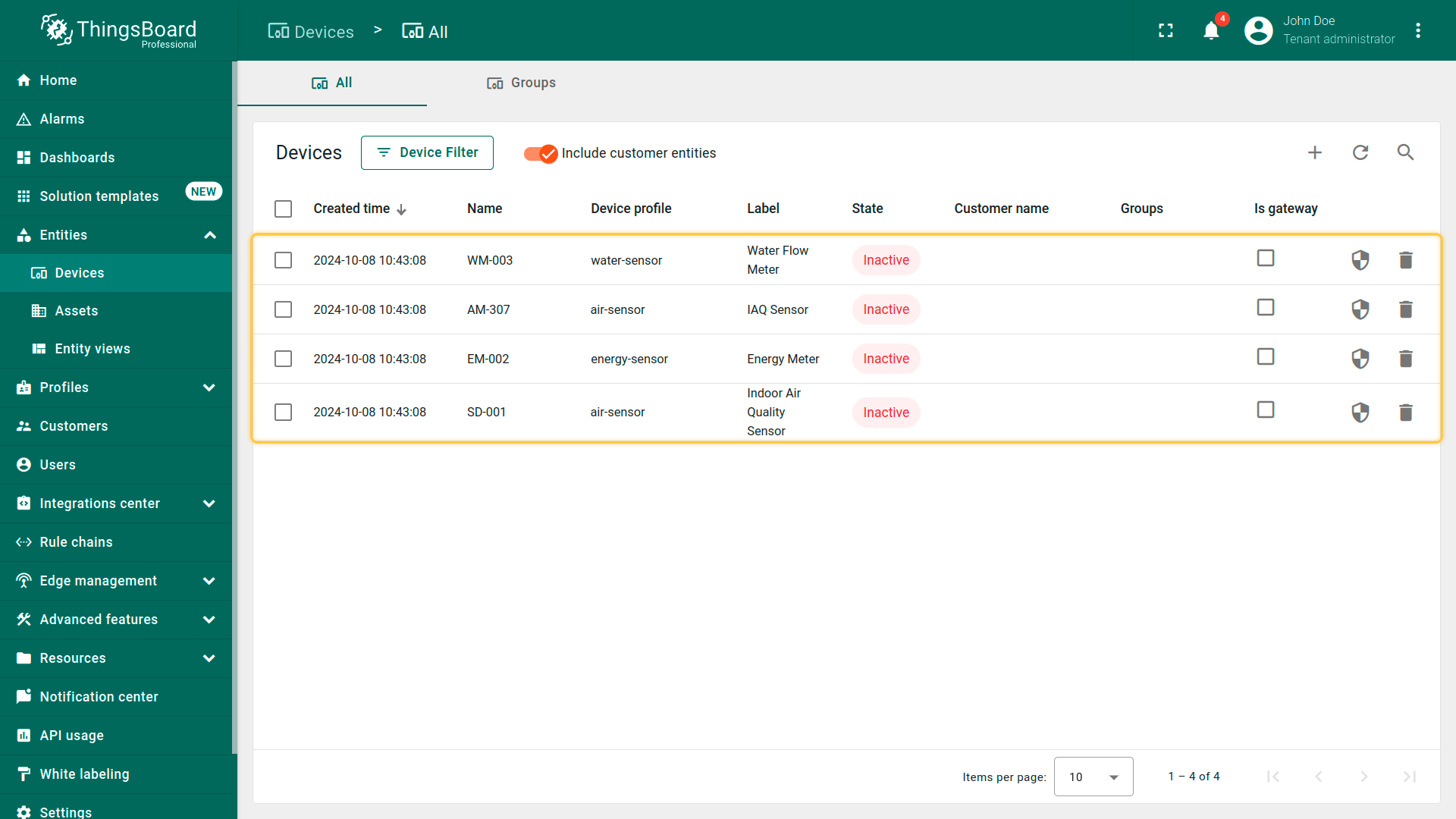 - Navigate to the “Devices” page of the “Entities” section on the sidebar. By default, you’ll be redirected to the “All” device group;