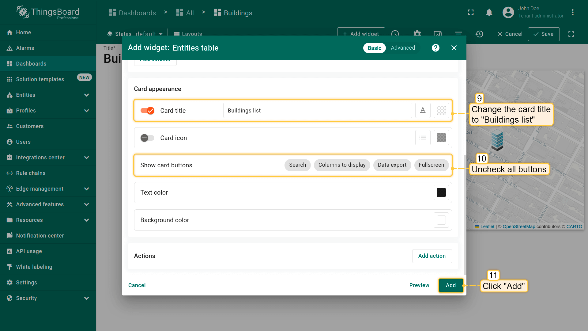 - Change the card title to "Buildings list", uncheck all buttons of the "Show card buttons" section, and click "Add";