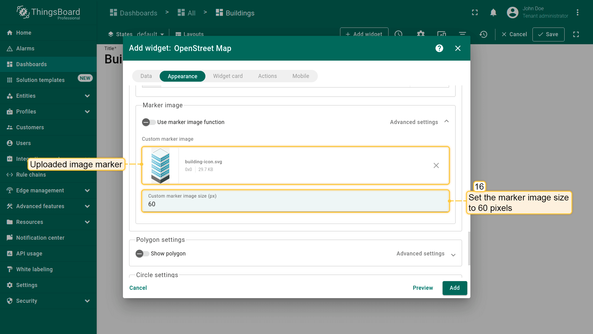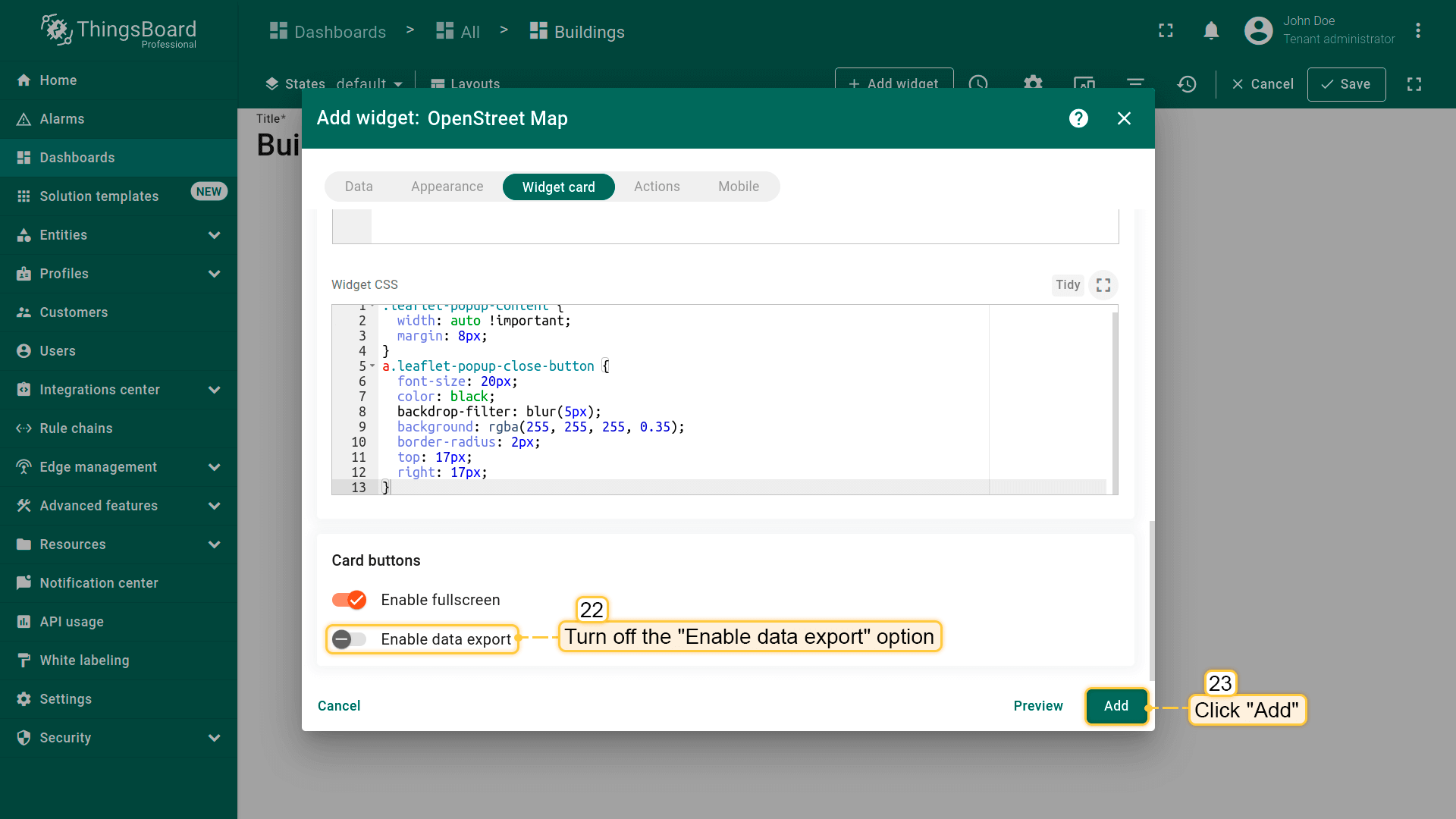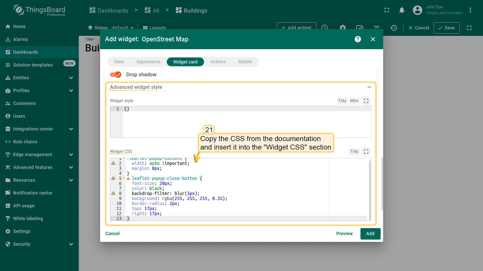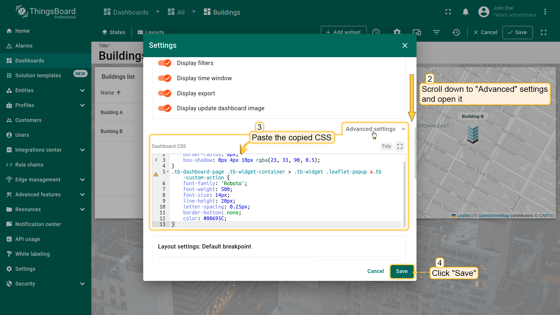 Let's make our dashboard more appealing by customizing its appearance. We will set a custom background for the “Buildings” state and apply custom CSS styles to the widgets.