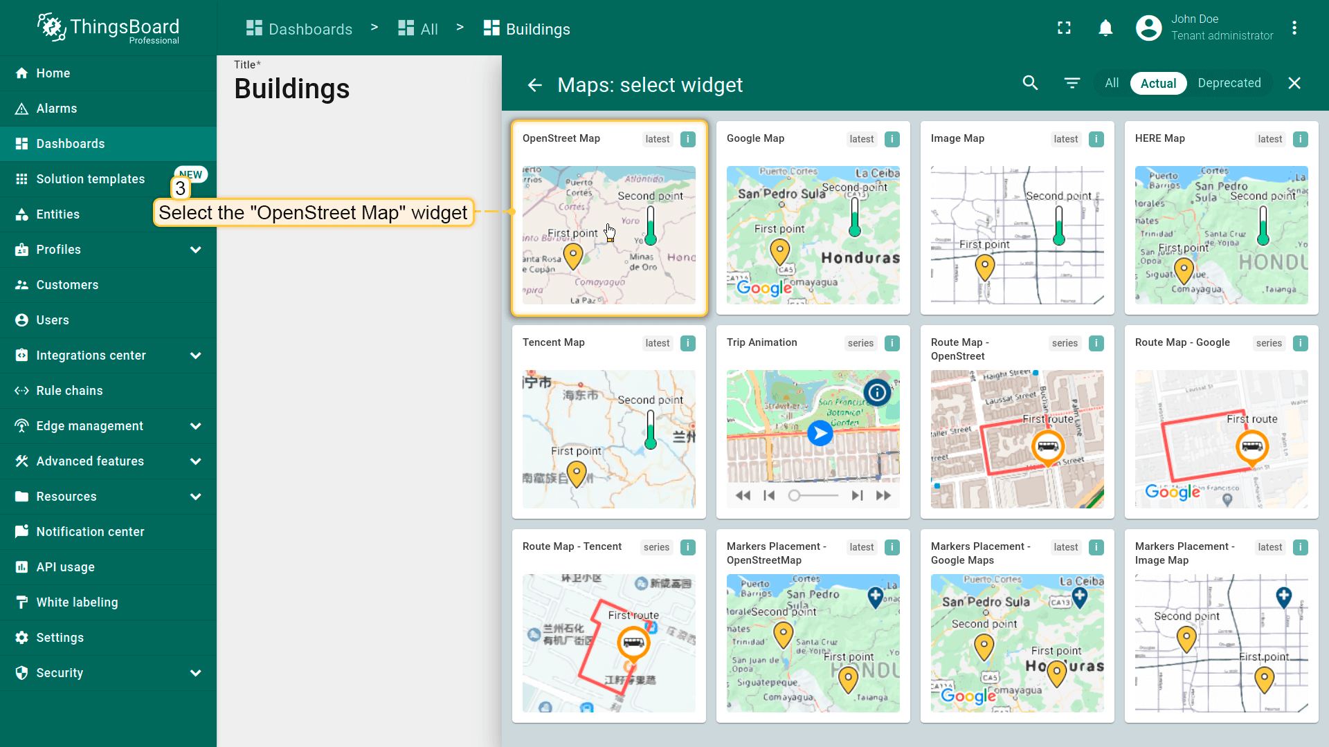 Now we move on to the most interesting part — adding your first widget – OpenStreet Map, which will display our two assets on the map: Building A and Building B. To display the buildings on the map, we need to set their coordinates - latitude and longitude as the attributes.