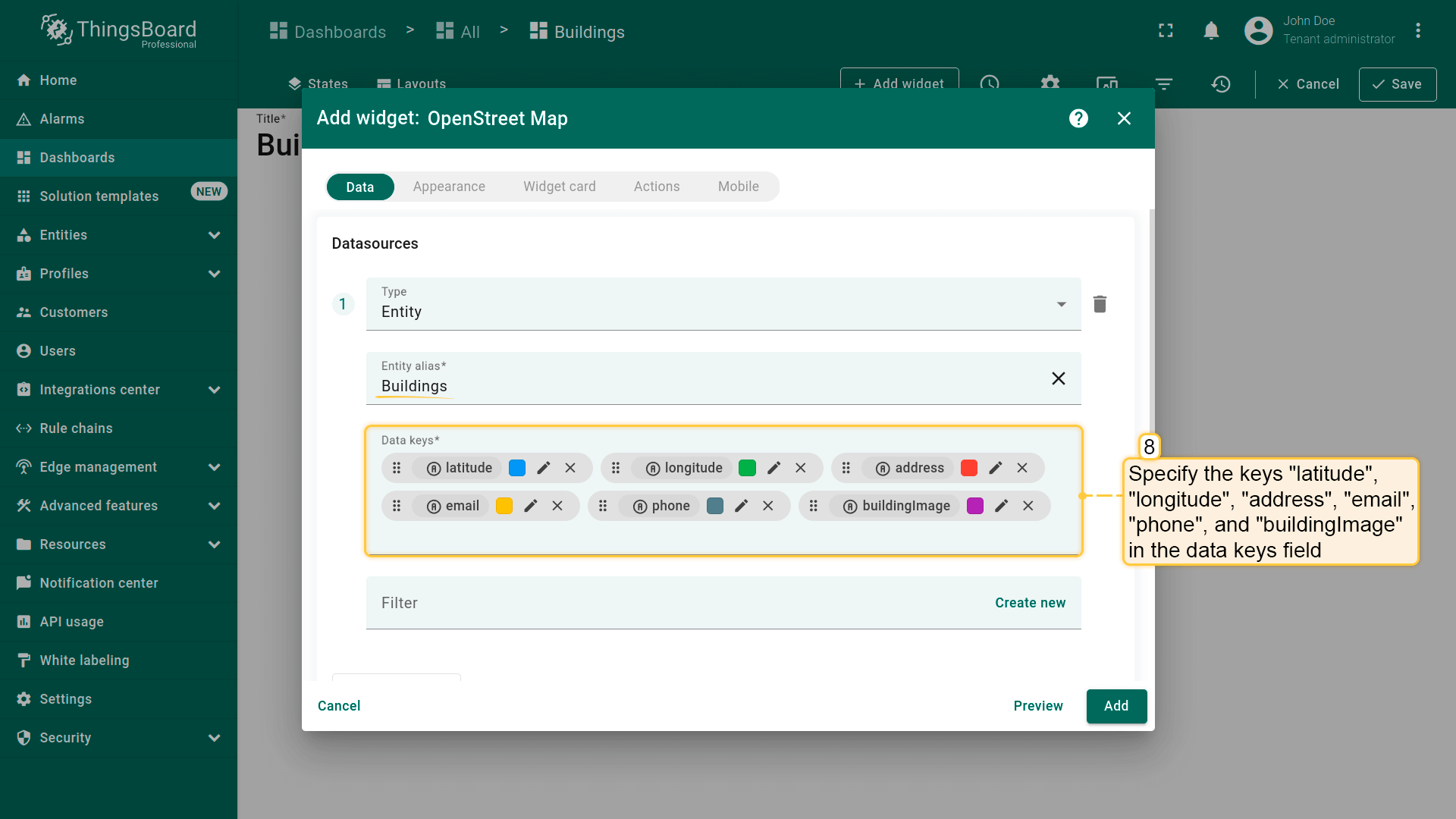 - Now, add the following attributes as data keys: “latitude”, “longitude”, “address”, “email”, “phone”, and “buildingImage”.