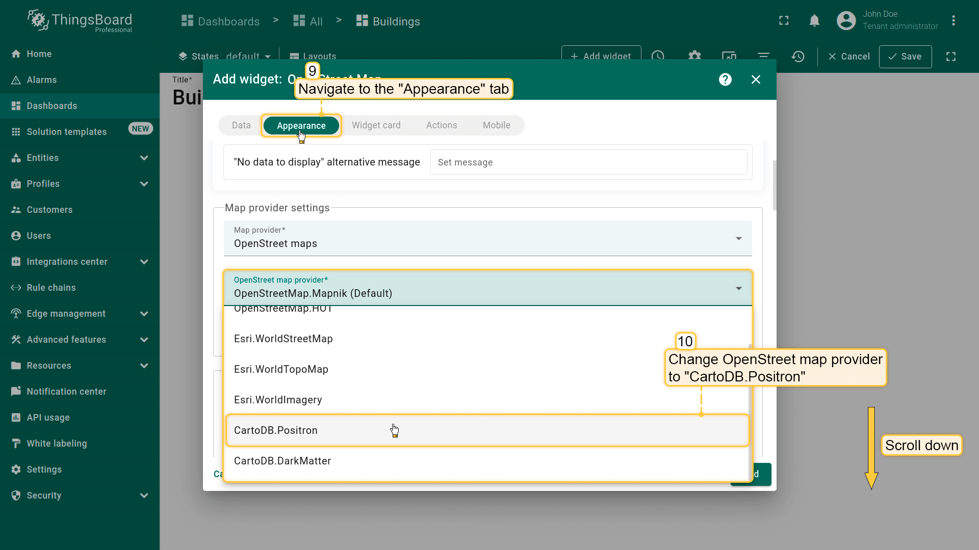 - Navigate to the “Appearance” tab. Change OpenStreet map provider to “CartoDB.Positron”;