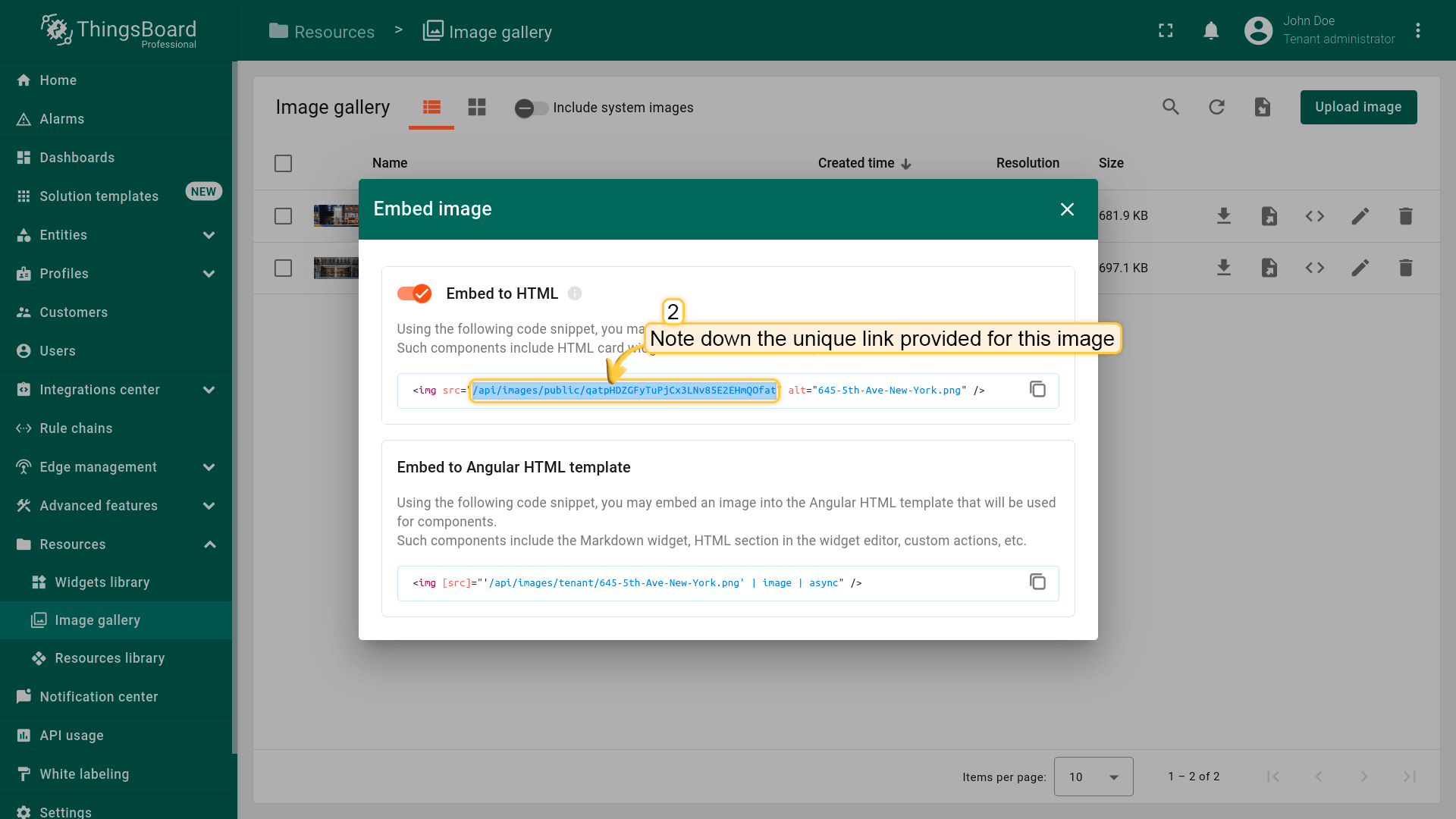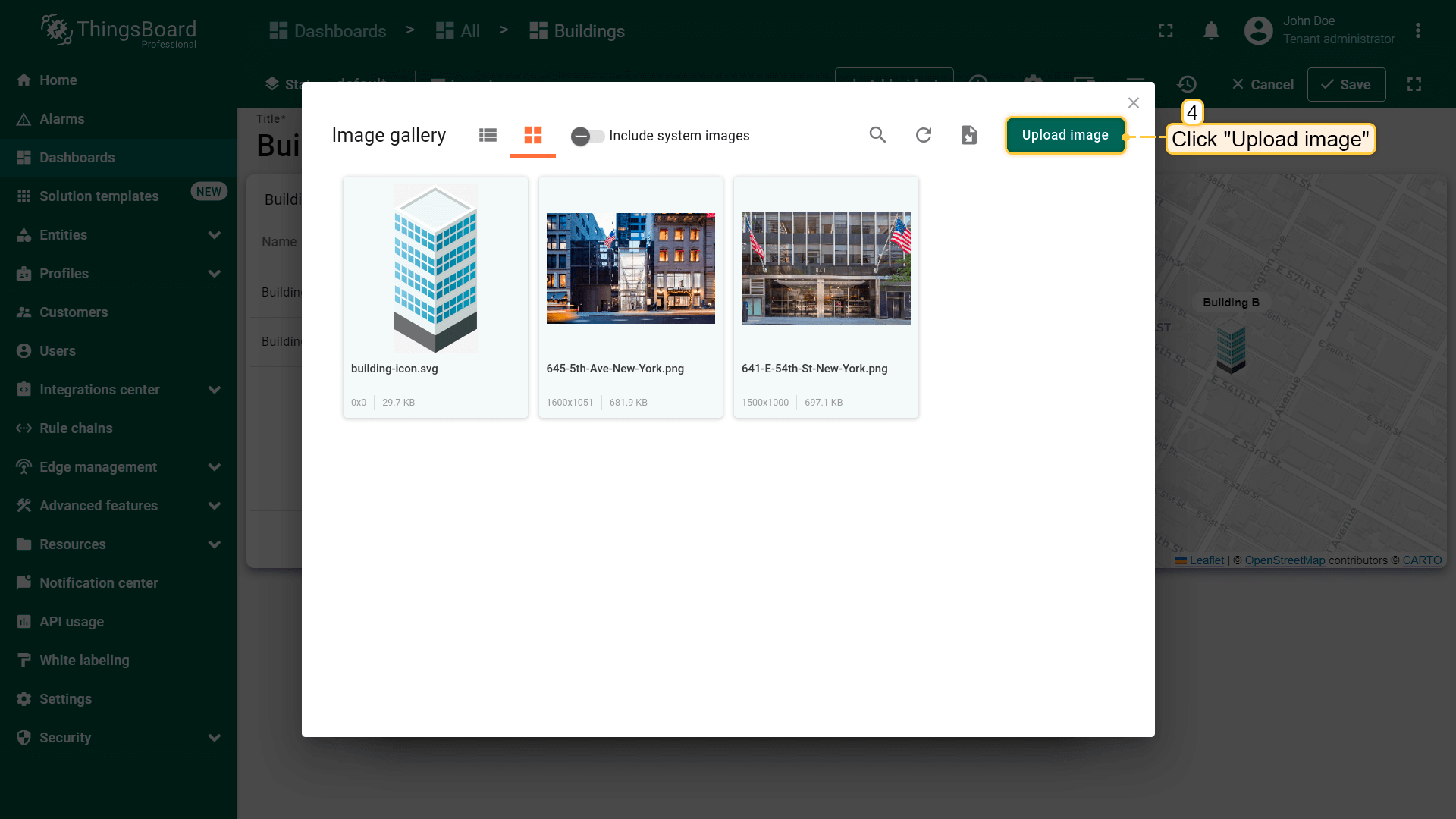 Building images need to be uploaded to the Image gallery, which serves as a centralized repository for storing and managing images. They will be used in the tooltip of the map widget. You can use the Building A and Building B images from this guide or upload your own images.