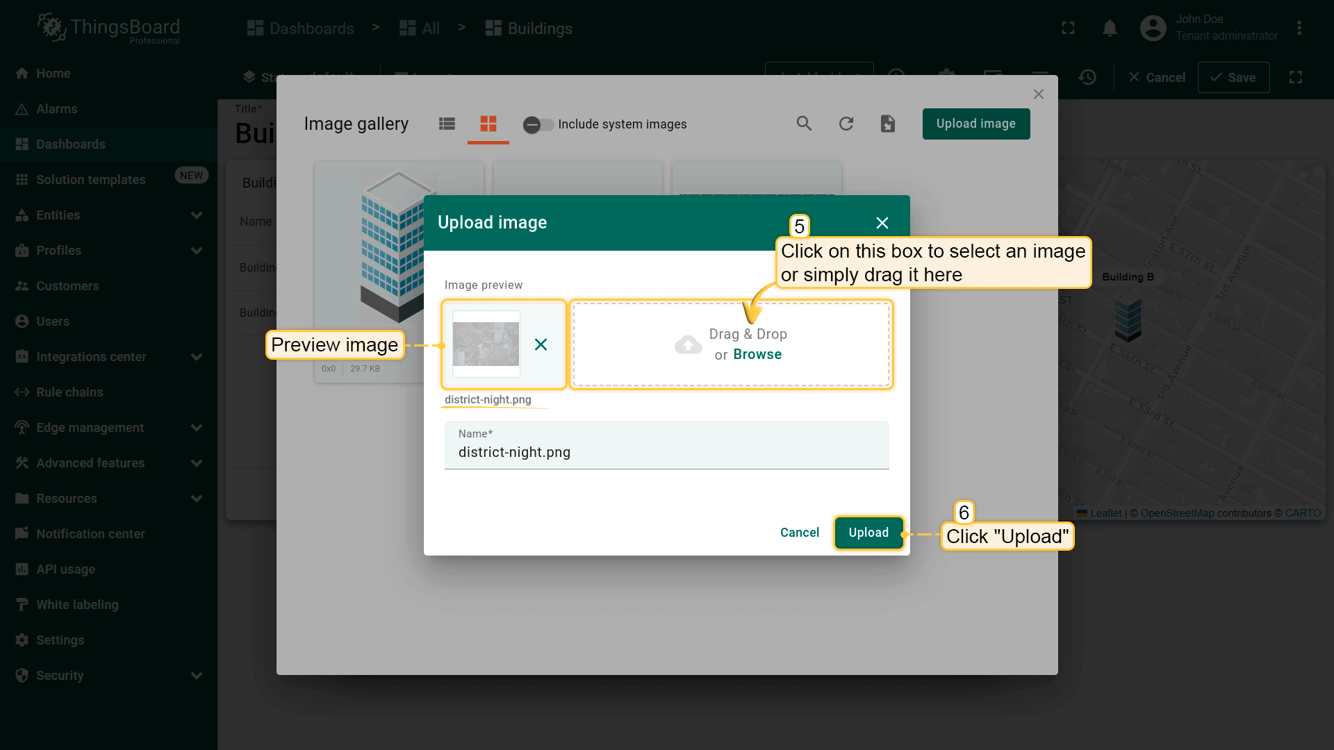 - Select an image for Building A or simply drag it to the "Upload image" window and click "Upload" button;