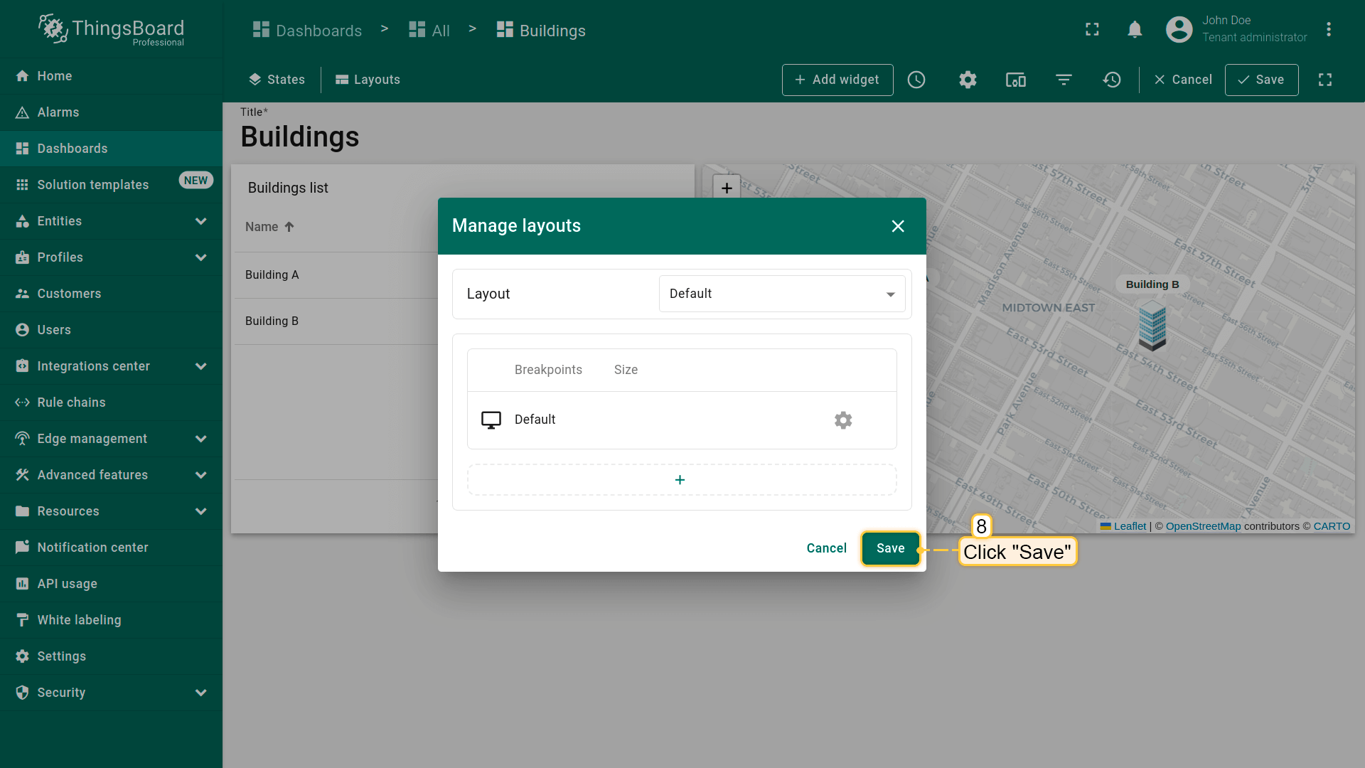 Congratulations, we have added your first widget, that displays our two buildings. Move the widget to the top-right corner of the dashboard and resize it by grabbing any corner and dragging it. After adjusting the placement and size of the widget, click the “Save” button in the top-right corner to save the dashboard.