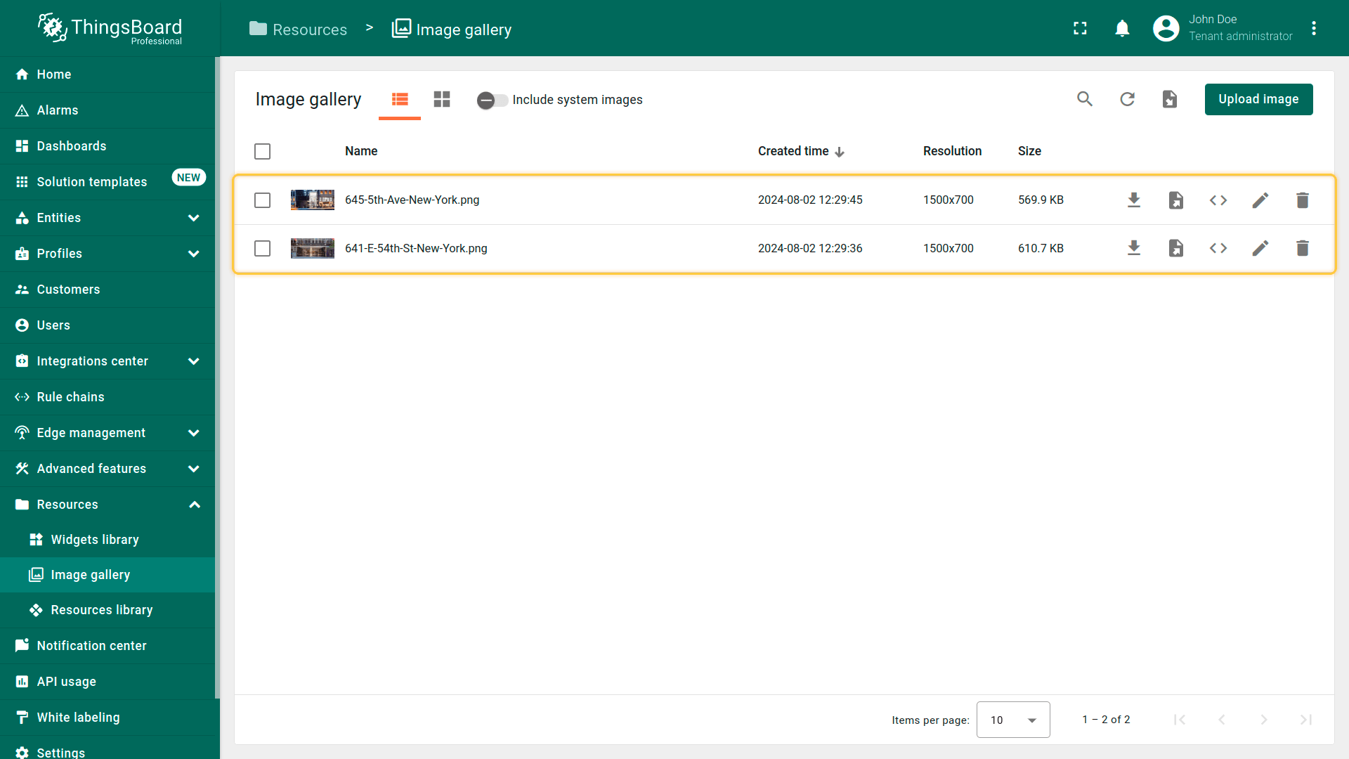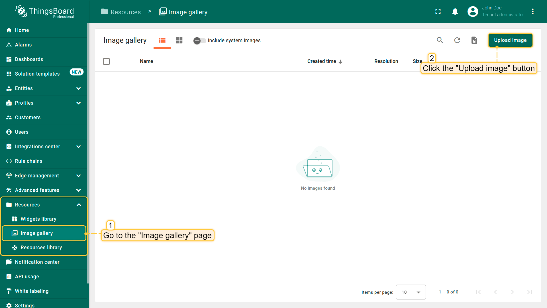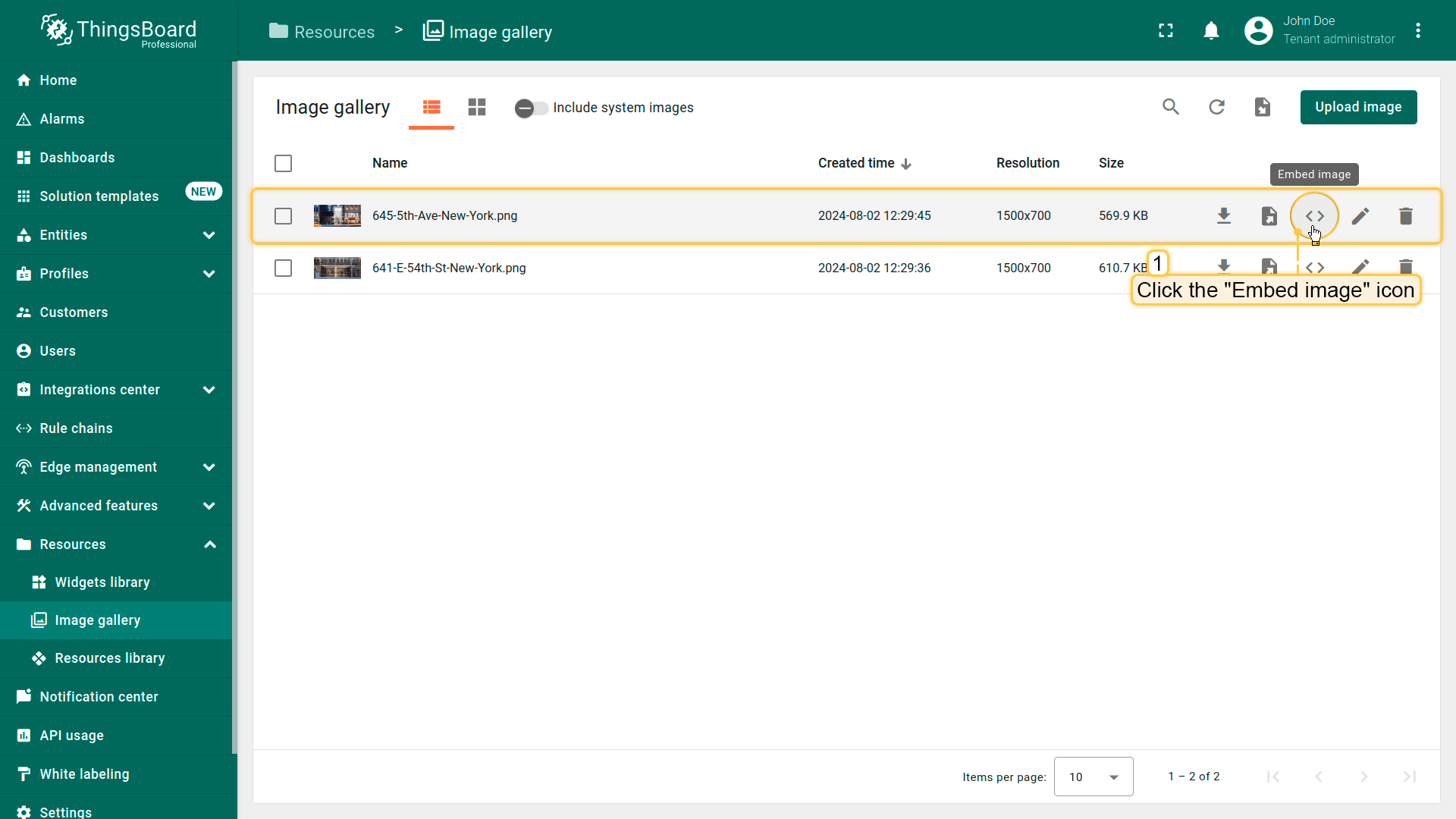 - Go to the "Image gallery" page in the "Resources" section. To upload a new image, click the "Upload image" button in the top-right corner of the screen;