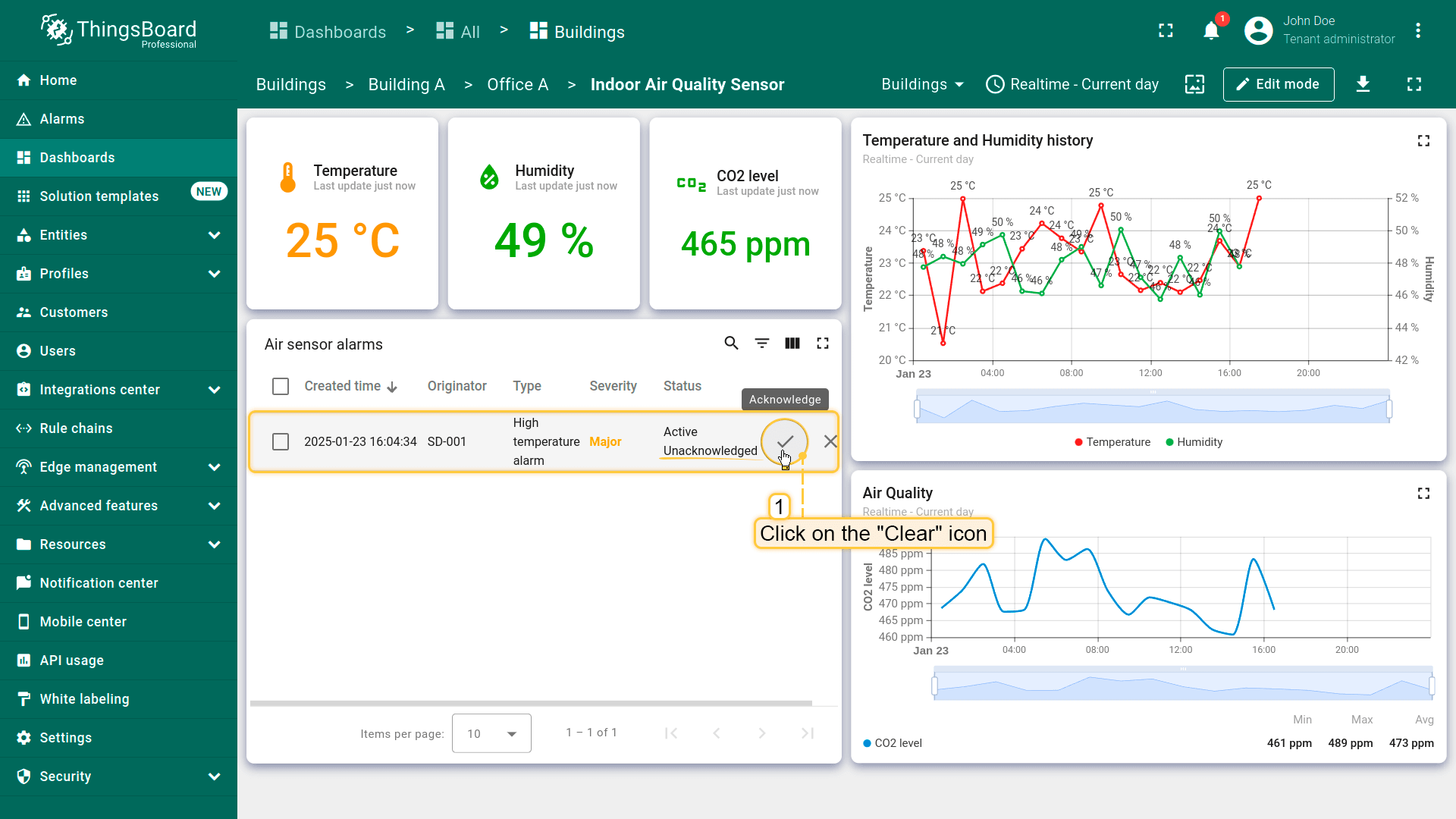 Return to the air_sensor dashboard state. In the “Alarms table” widget, an alarm should appear displaying the created time, originator of the alarm, its severity and its status. When an alarm is triggered, it initially has the status “Active” and “Unacknowledged”. A user can acknowledge the alarm, changing its status to “Acknowledged”. However, it will remain active until it is resolved (cleared).