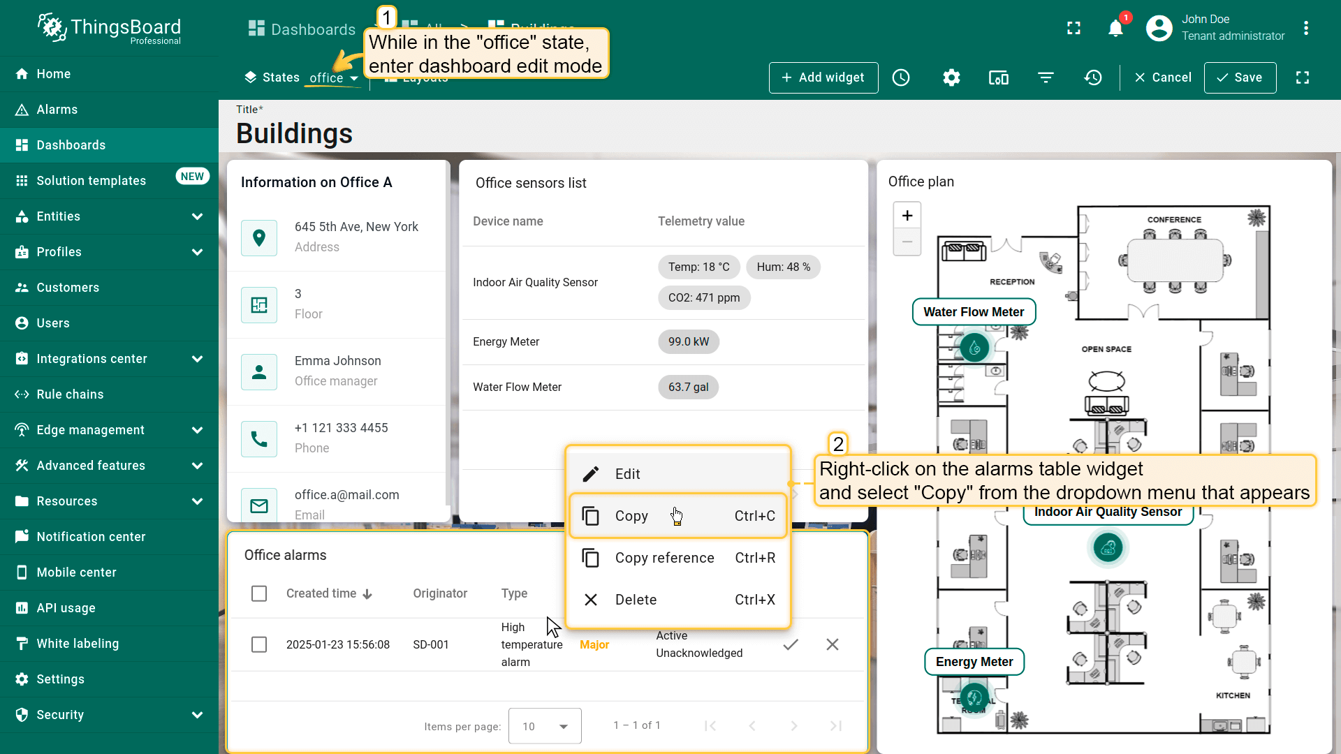 - Being in the office state, enter dashboard edit mode. Right-click on the alarm widget, and select "Copy" from the dropdown menu;
