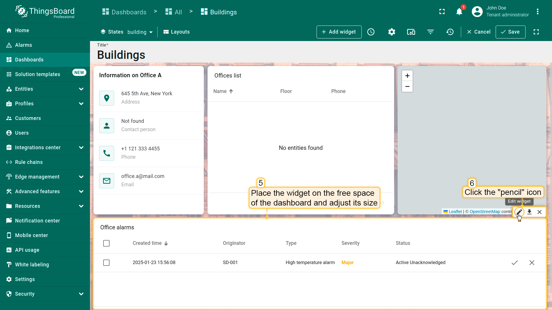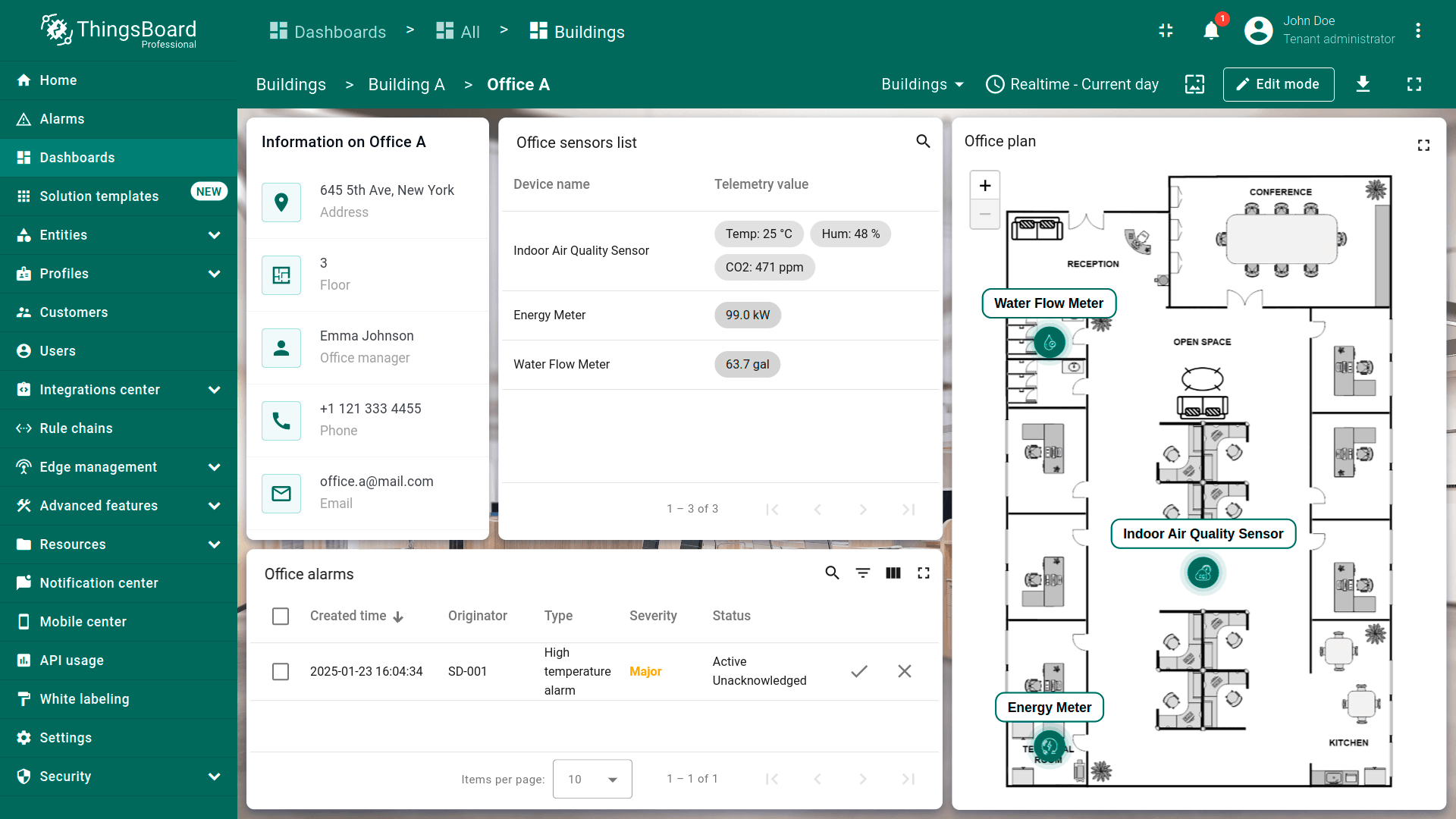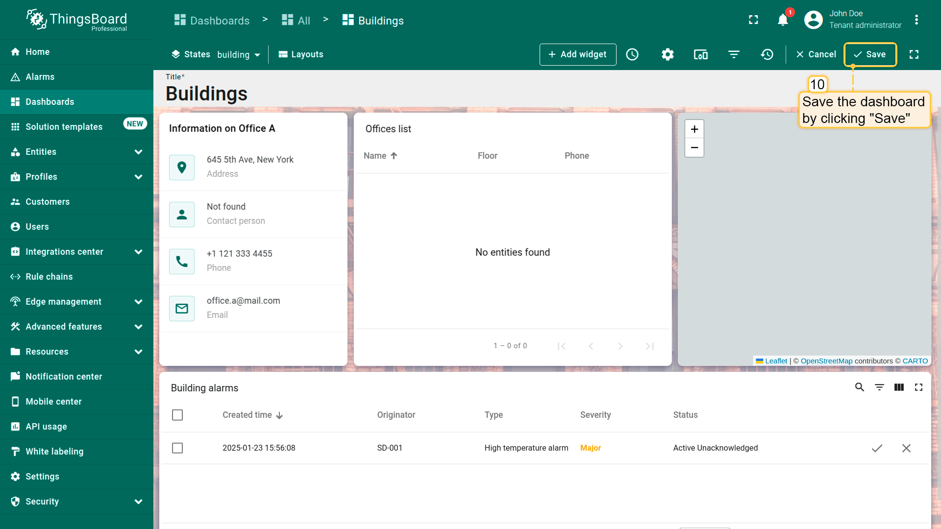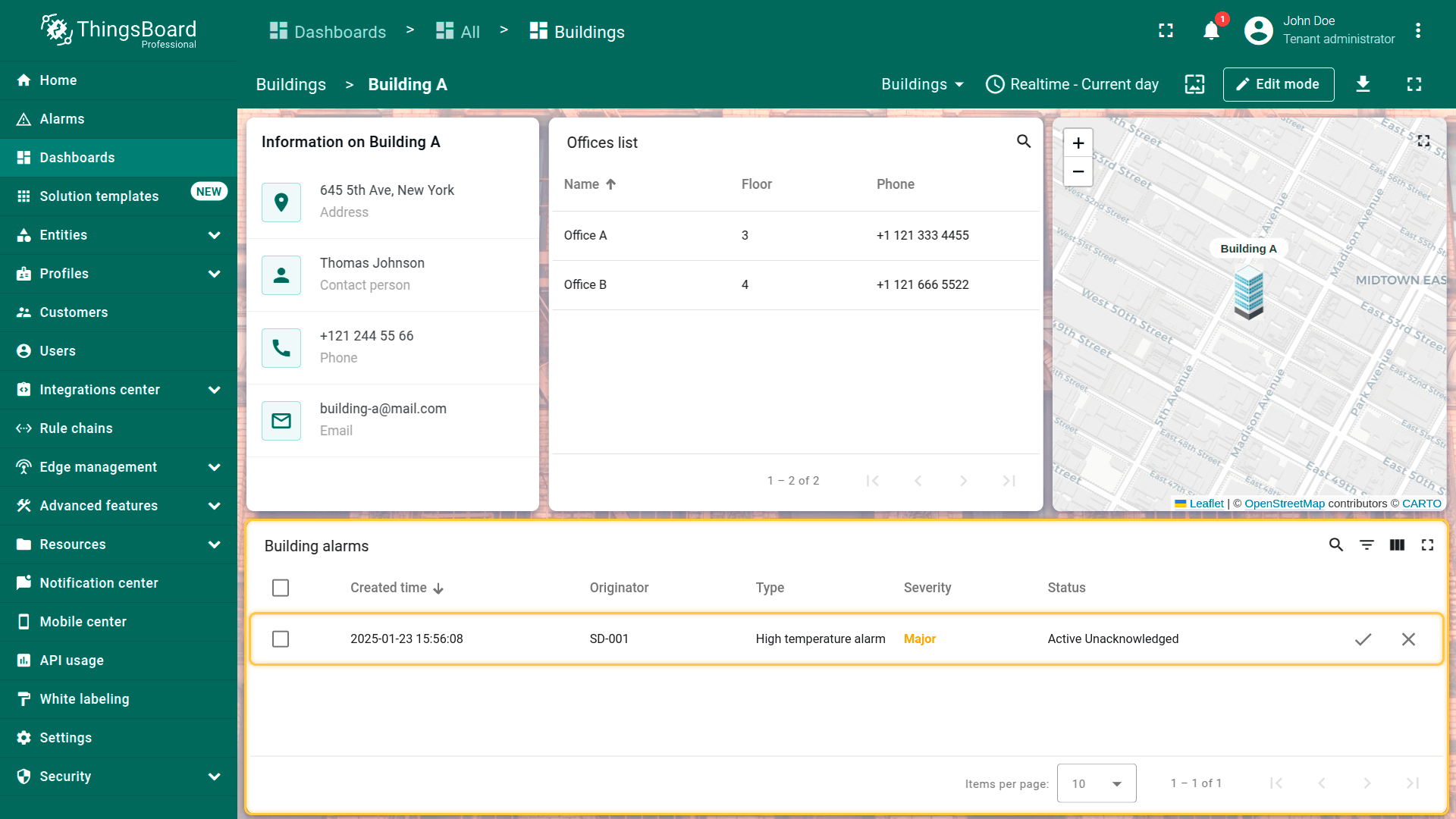 As you may notice, active alarms are not displayed in the widget. This happens because the “Office A” entity is currently selected, while the alarm was created on a device that has a relationship with this office. Previously, in the alarm rule, we specified that the alarm should propagate to related entities.