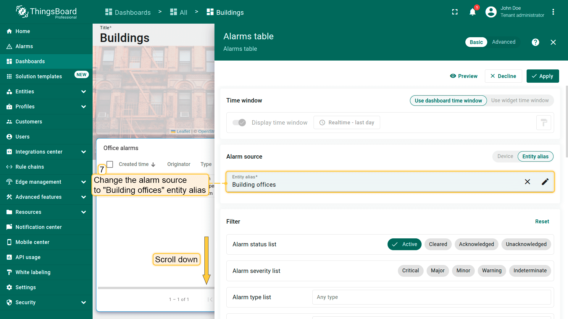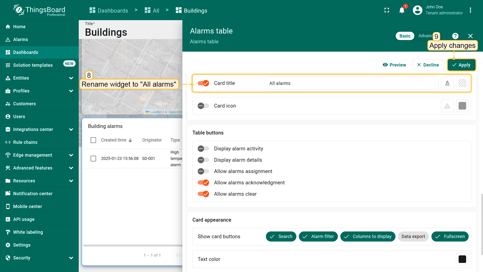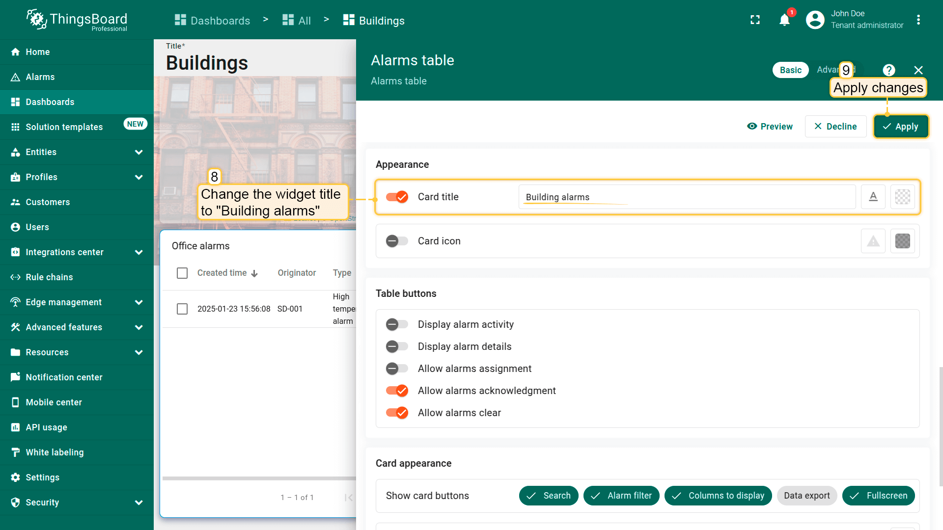 - Change the widget title to "Building alarms". Then, apply the changes;