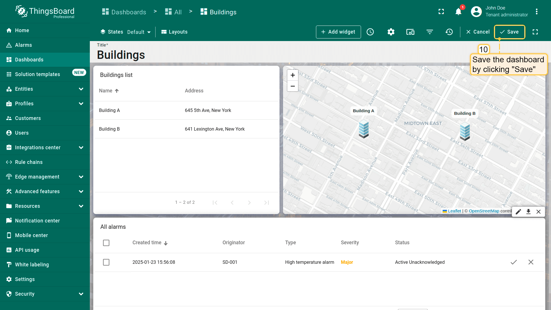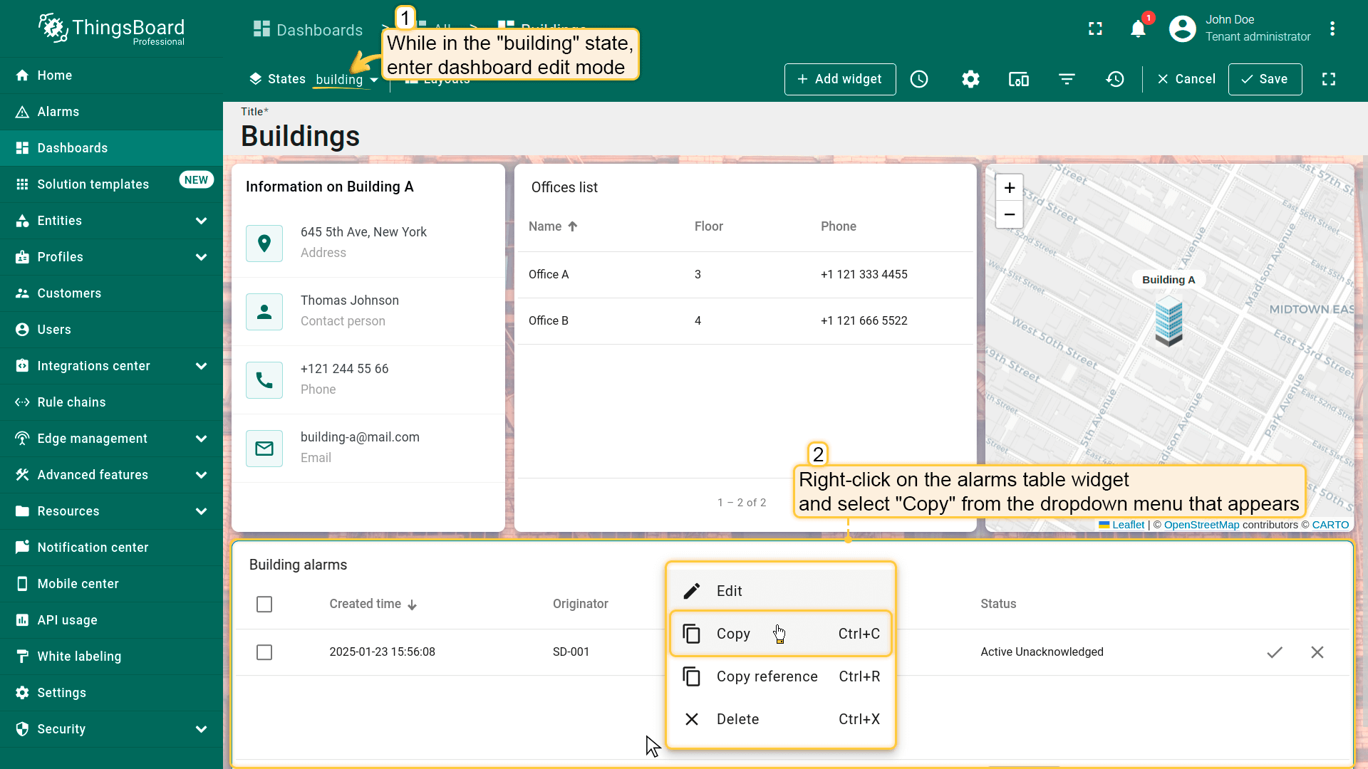 Similar to the previous steps, we will add an alarm widget to the building state. This widget will display alarms from all devices associated with the selected building. We will also add this widget using the copy method.