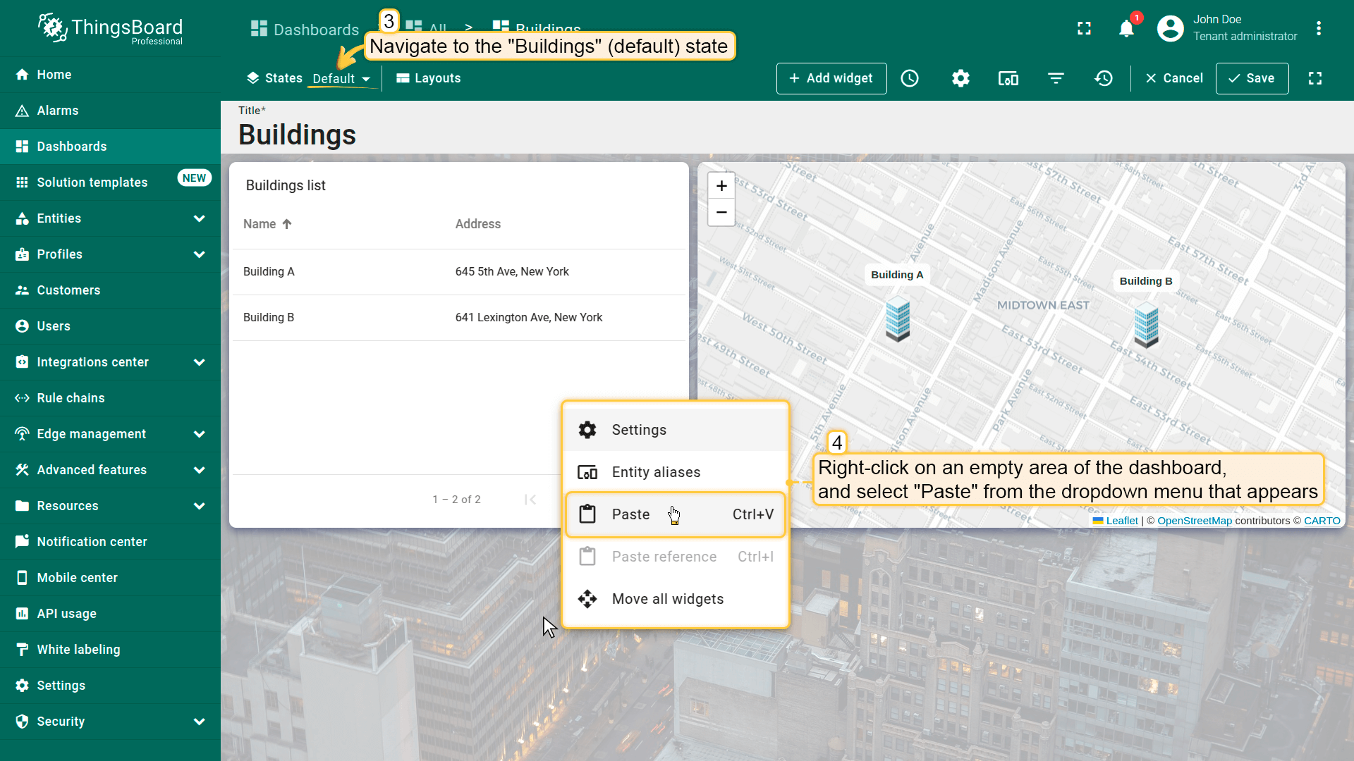 - Navigate to the Buildings (default) state, right-click on an empty area of the dashboard, and select "Paste";