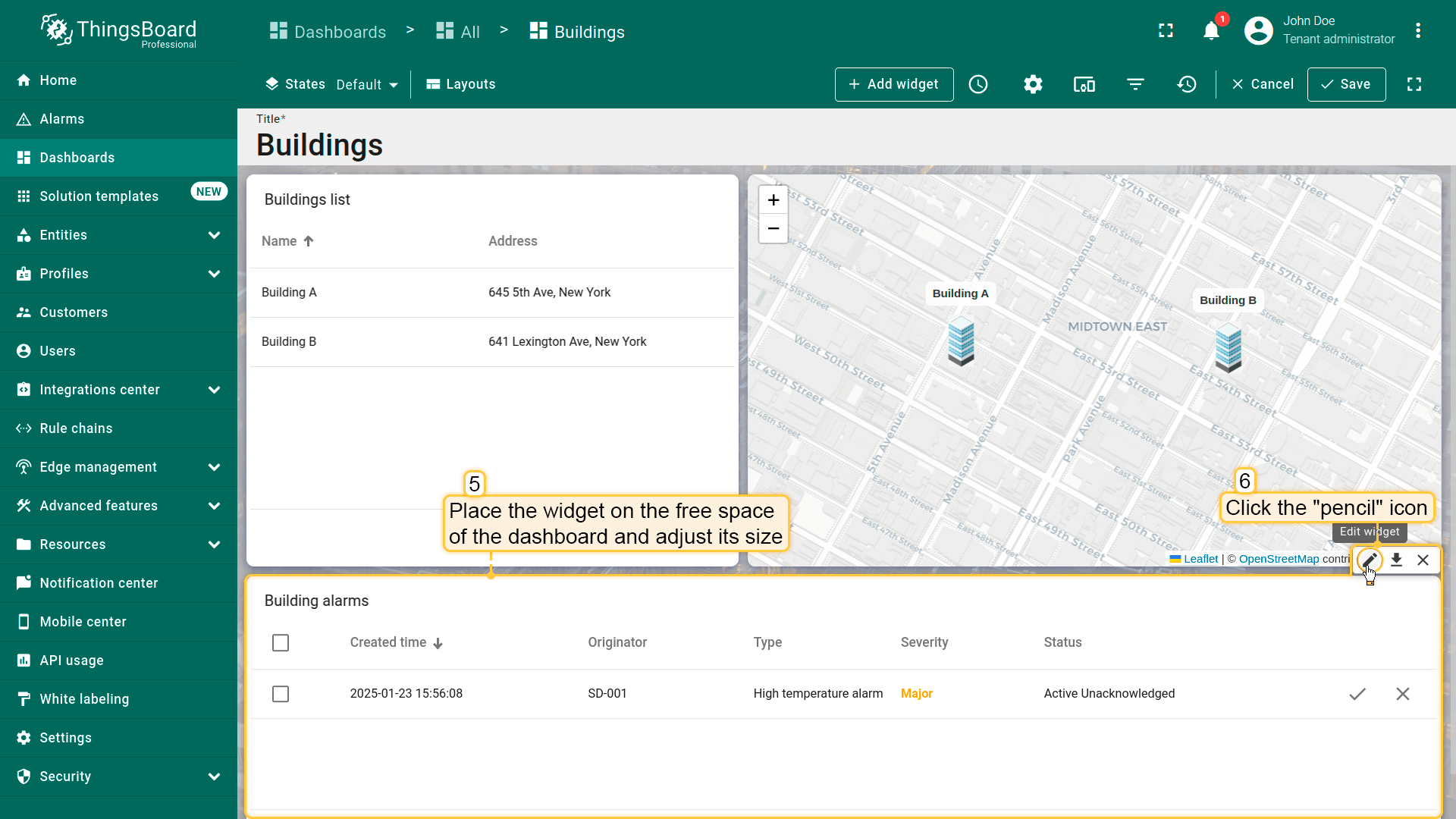 - Place the widget in an empty area on the dashboard and adjust its size. Then, click the "pencil" icon on the alarm widget to edit it;