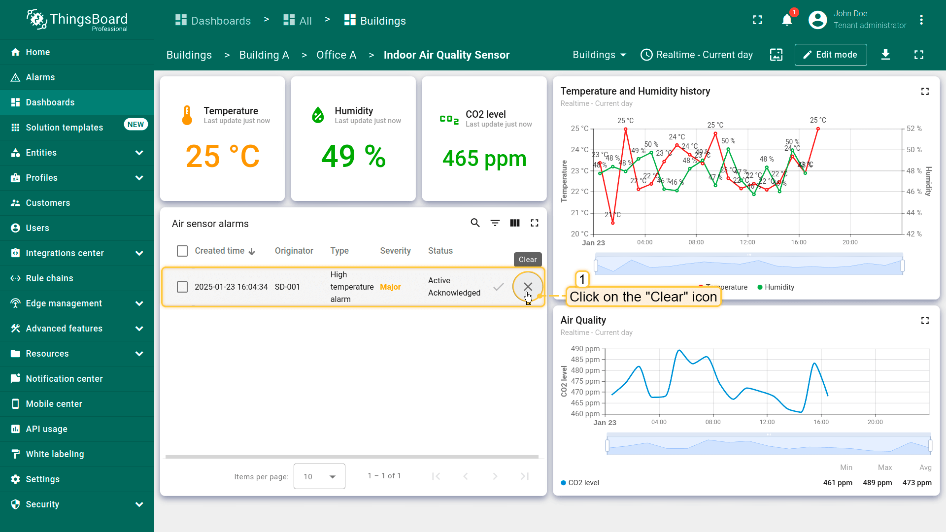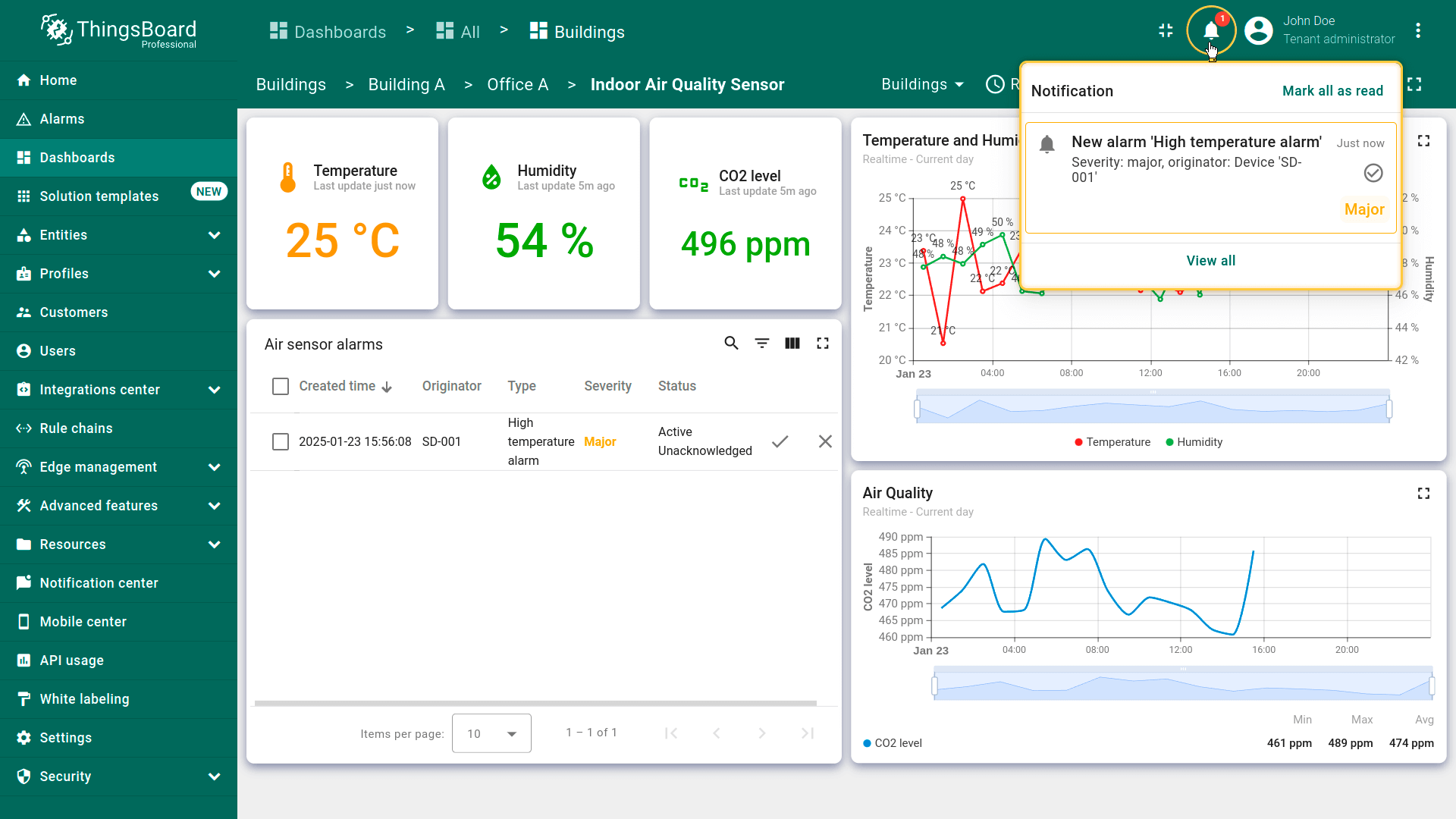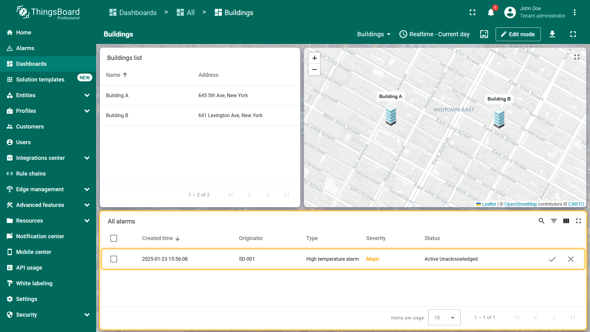 An alarm is a notification generated when a predefined condition or rule is met. Alarms are associated with entities such as devices, assets, customers, and others.