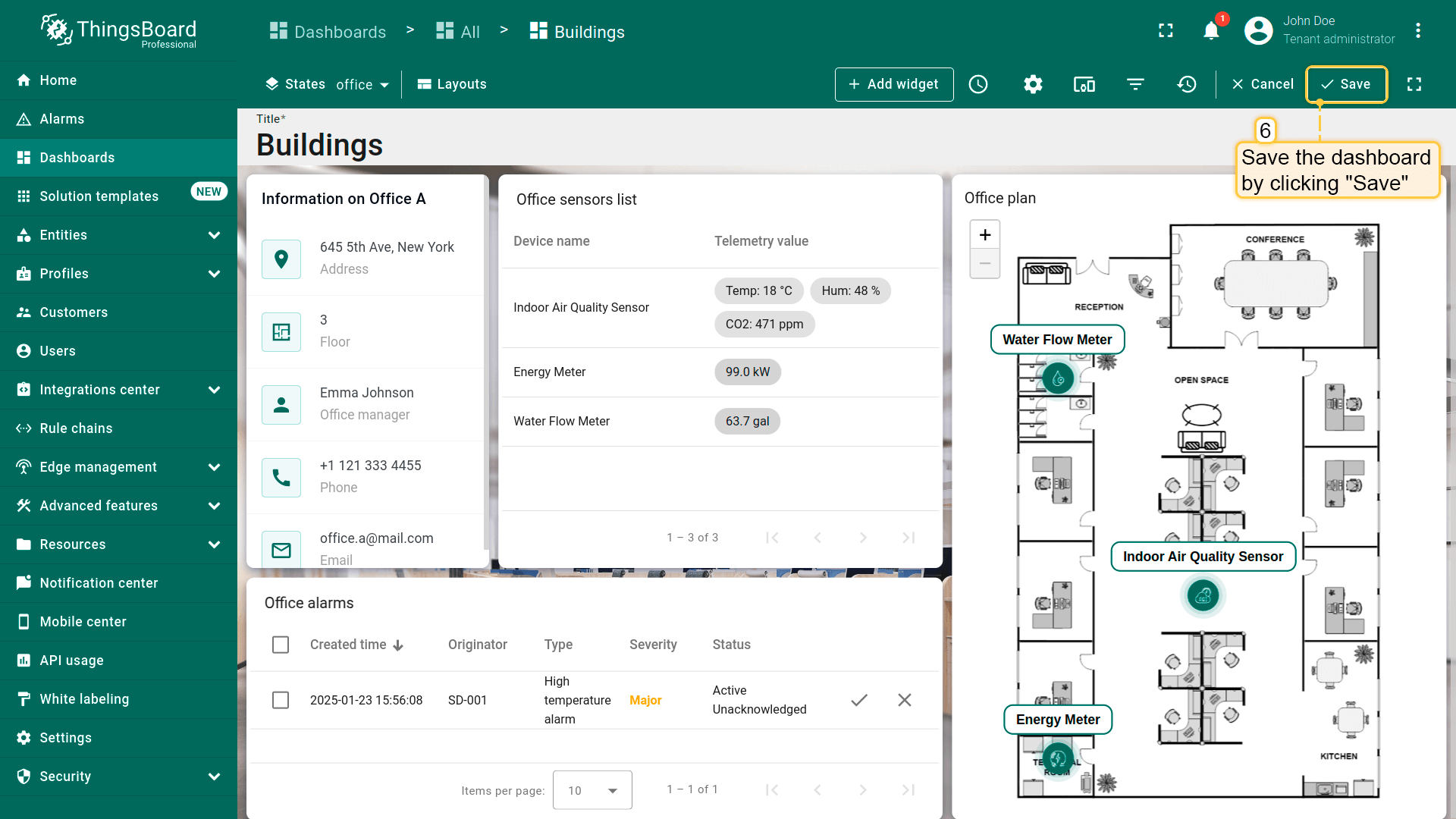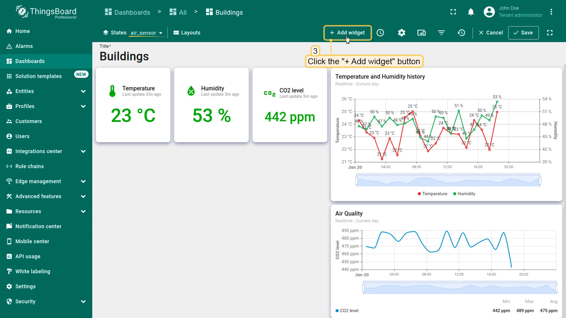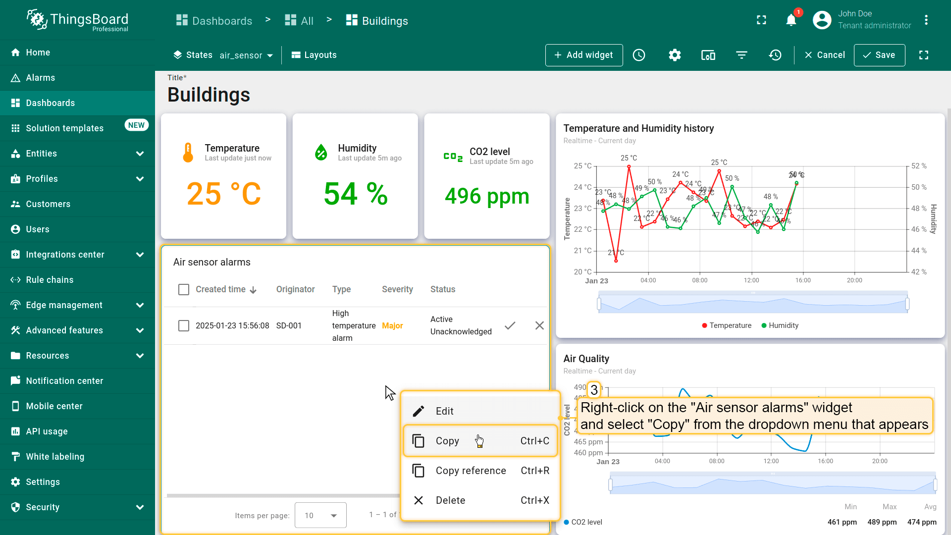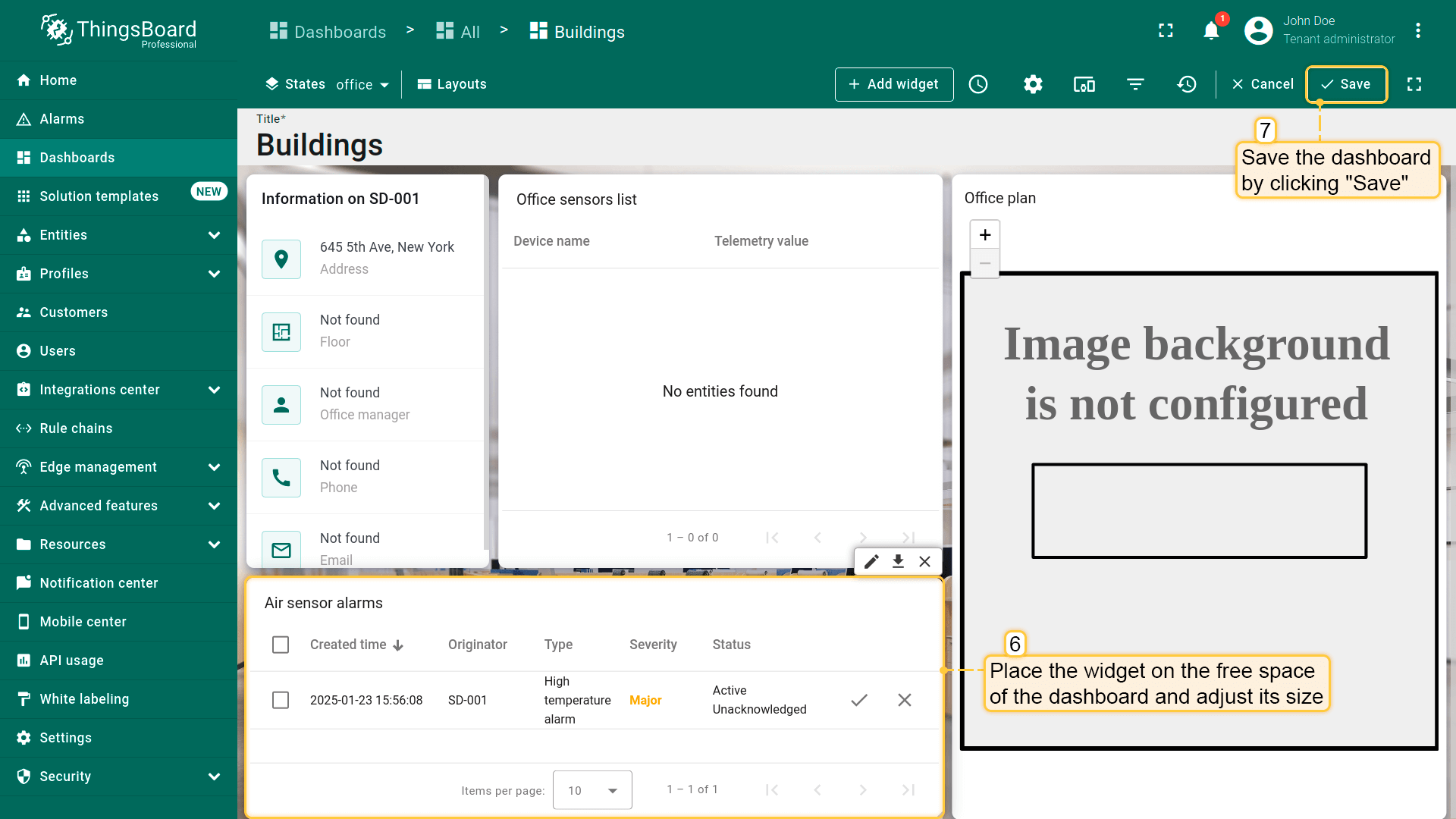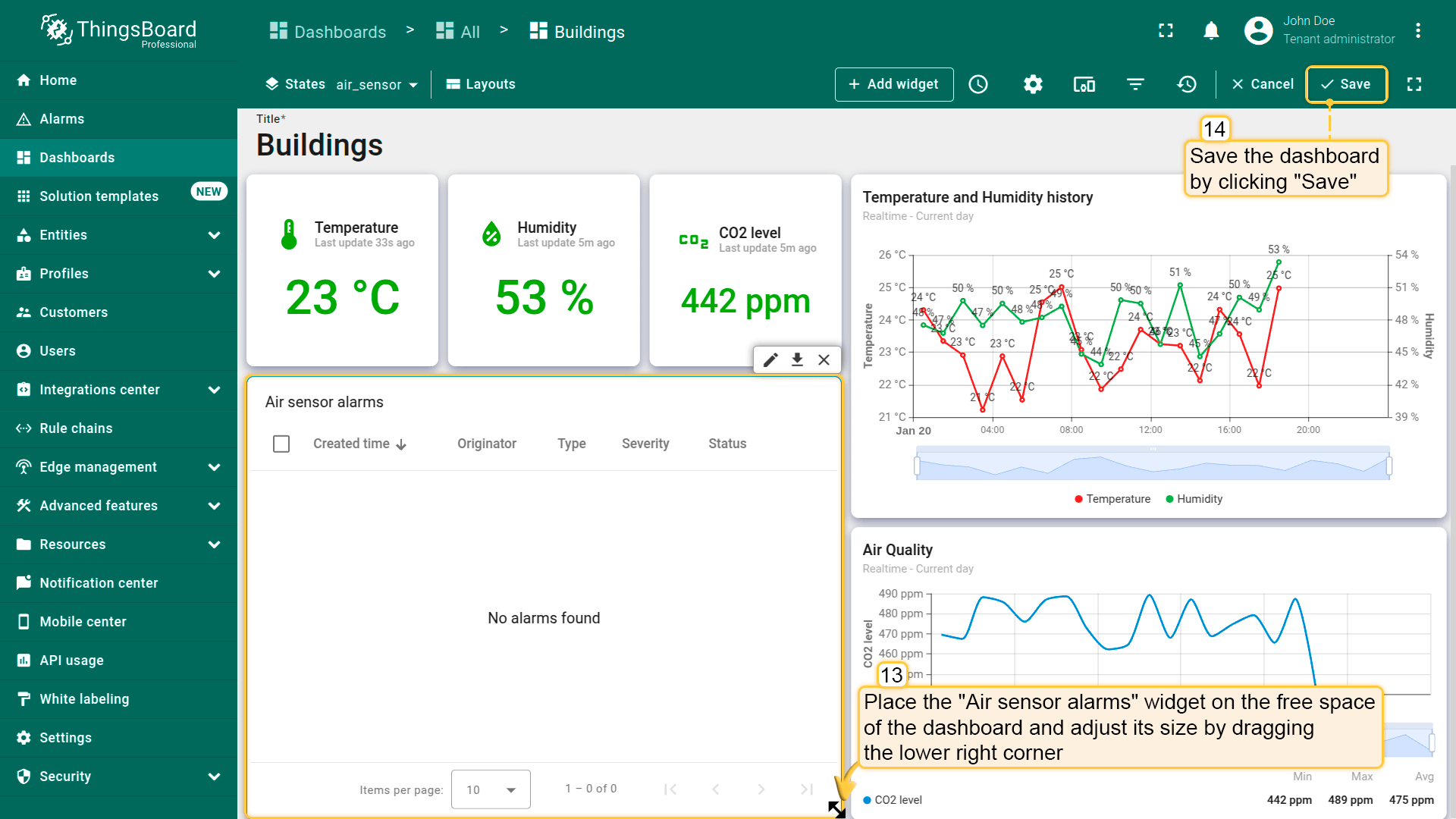 - We have added a widget that will display the active alarms for your device. Place the "Air sensor alarms" widget on the free space of the dashboard and adjust its size by dragging the lower right corner. Then, save the dashboard.