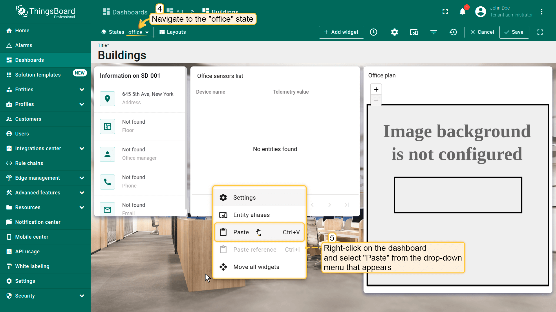 - Navigate to the office state, right-click on an empty area of the dashboard, and select "Paste";