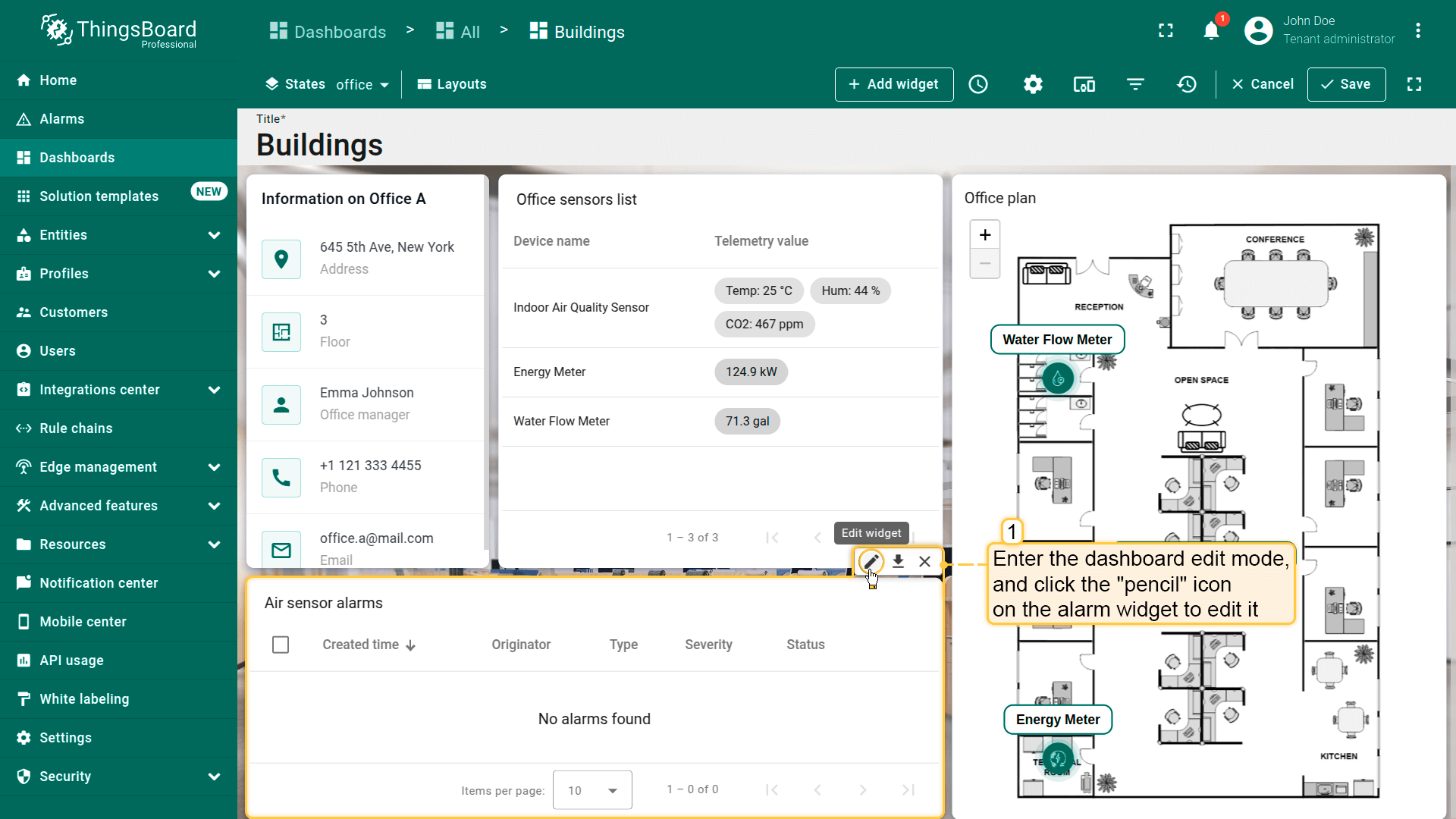 - Change the widget title to "Office alarms". Then, apply the changes;