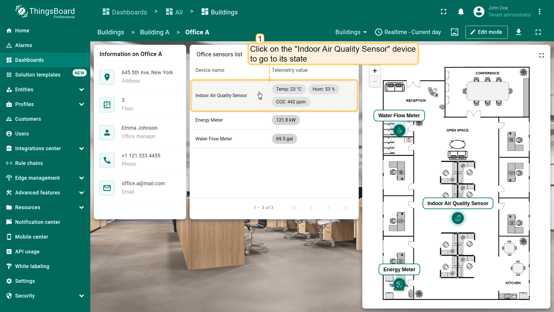 - Click on the "Indoor Air Quality Sensor" device row in the "Office sensors list" widget to transition to its state;