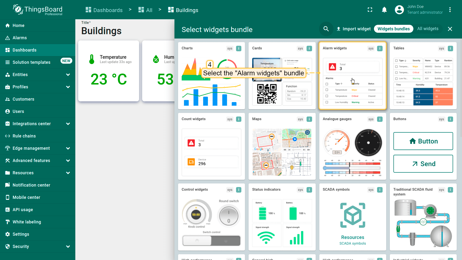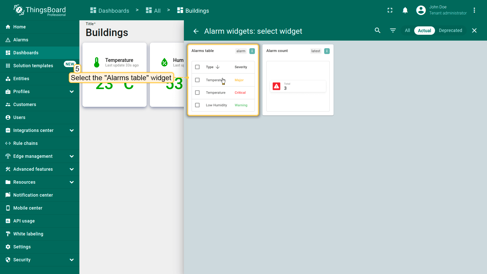 Now that we have defined all the alarm rules for the air-sensor device profile, the next step is to add a widget to manage the alarms.