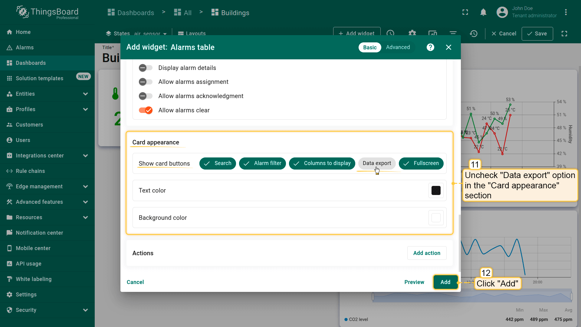 - Uncheck "Data export" option in the "Card appearance" section. Then, click "Add" to confirm adding widget;