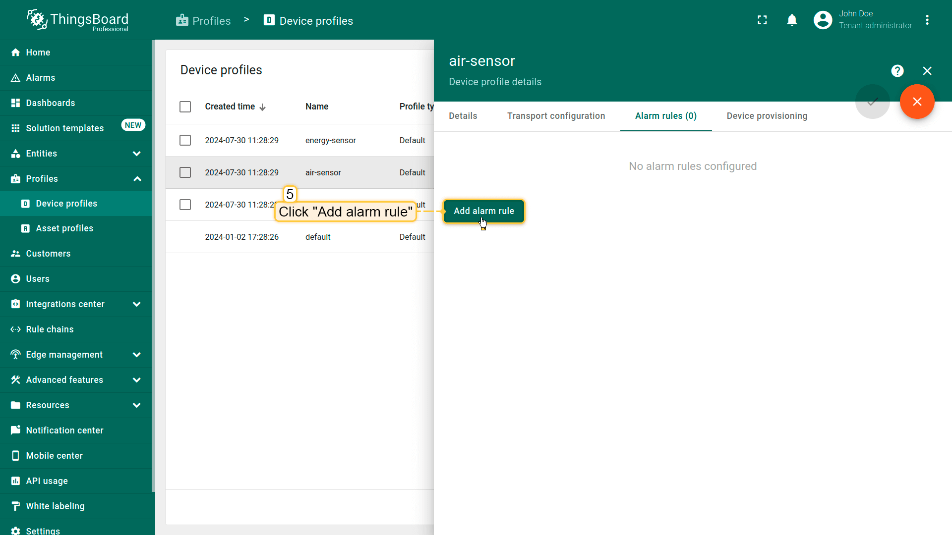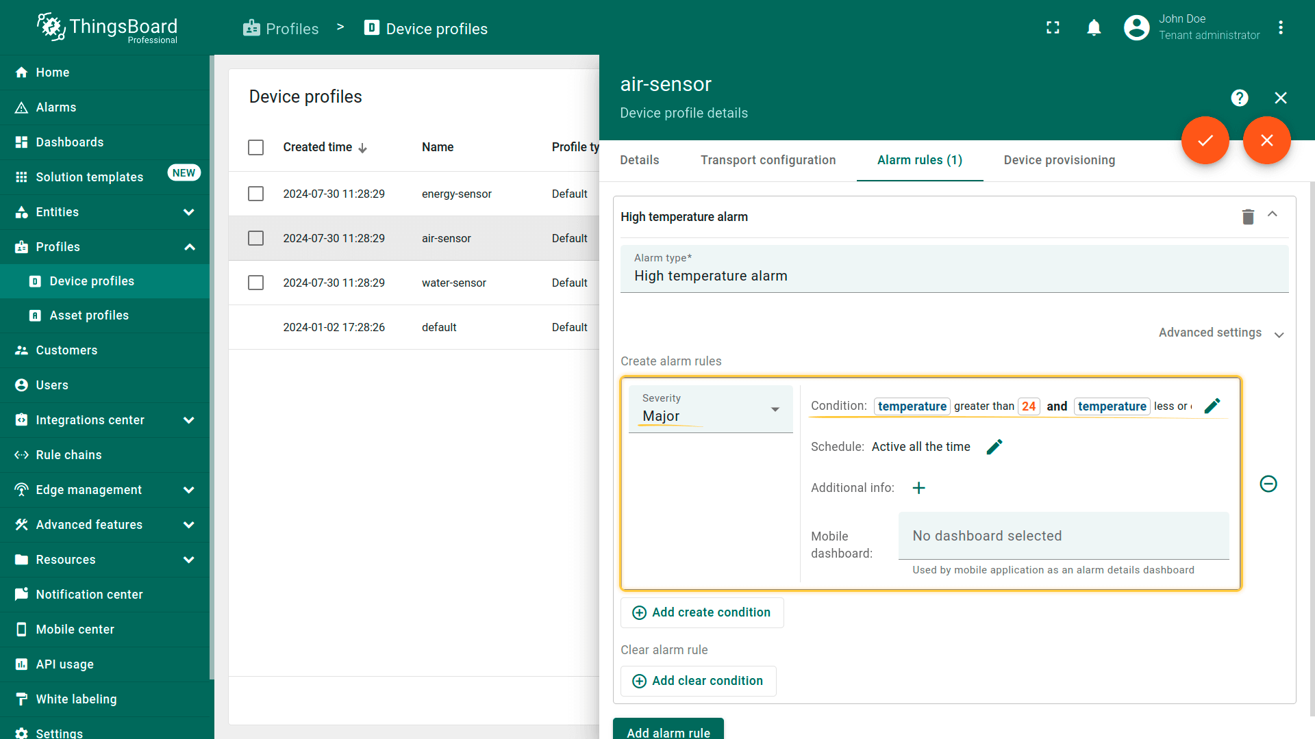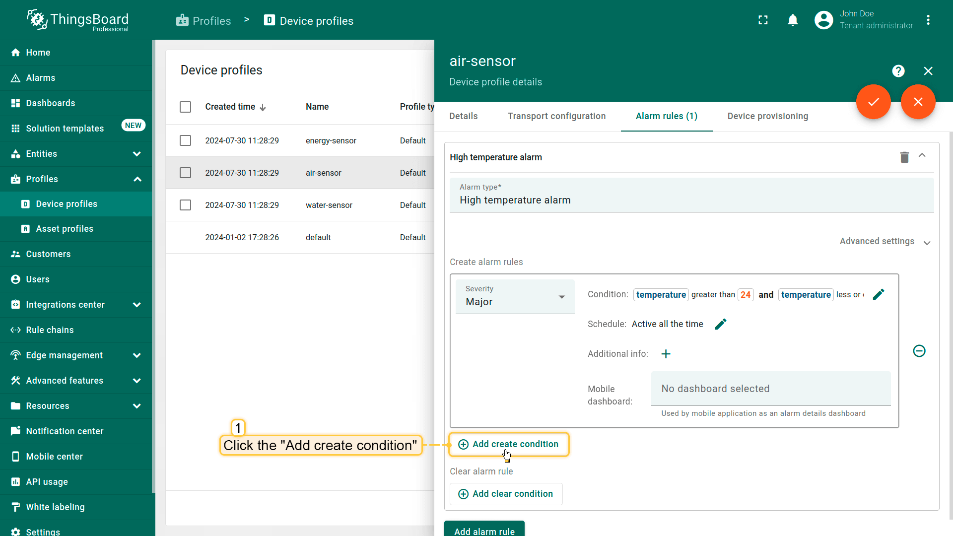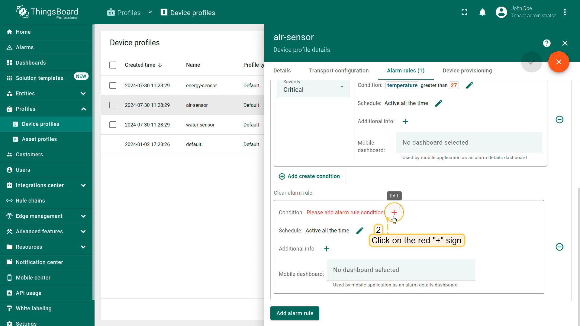 First, you need to define the rules that will trigger the alarm. The simplest way to create the alarm rule is to configure it within the device profile. These rules specify the conditions under which reminders should be generated.