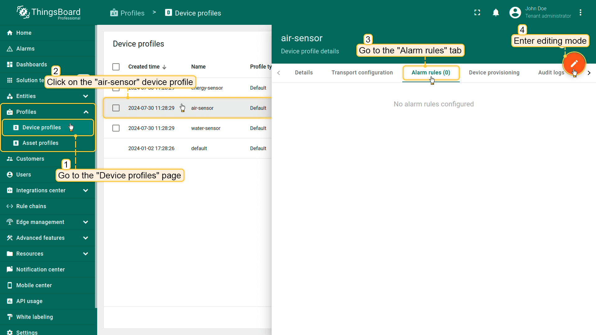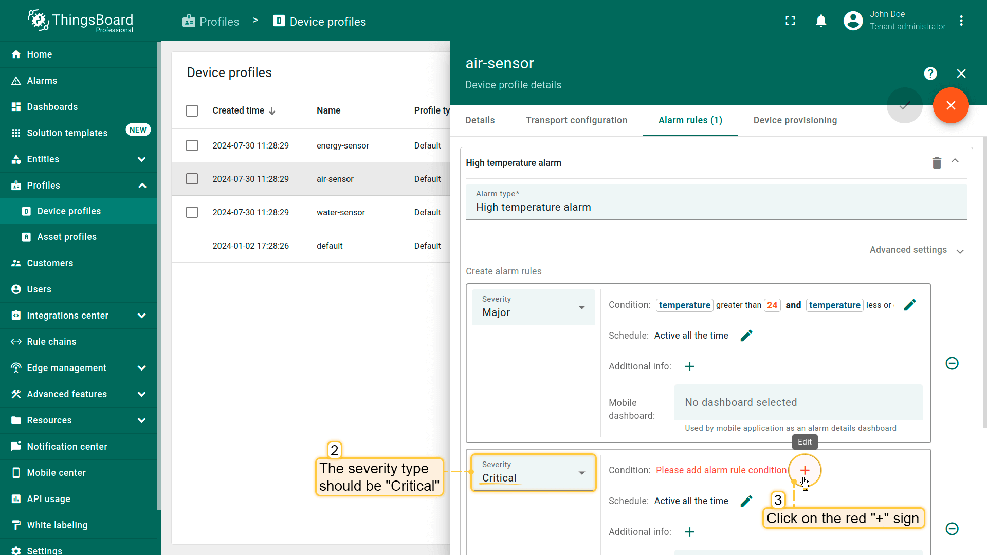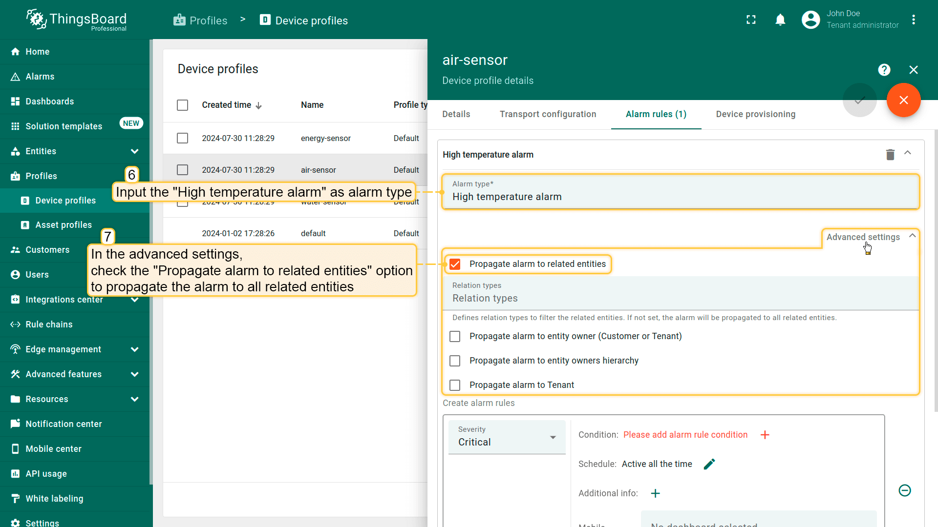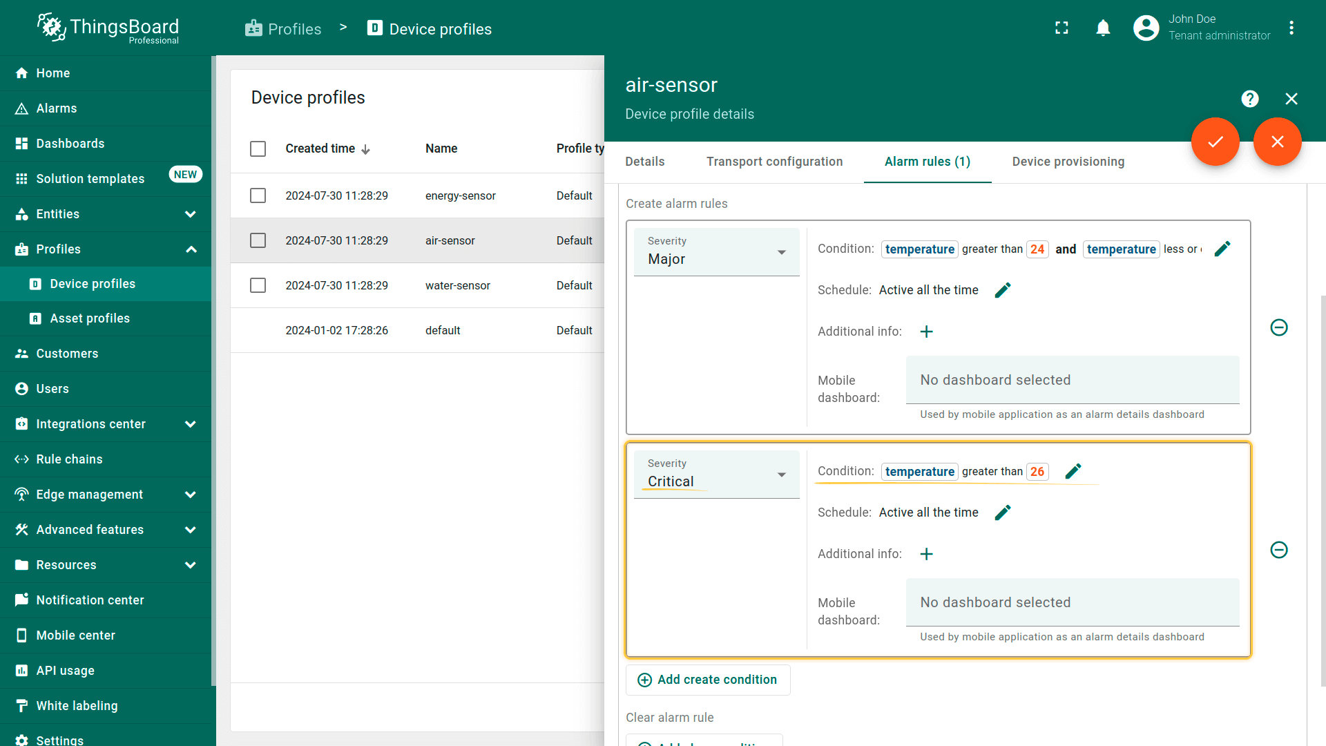First, you need to define the rules that will trigger the alarm. The simplest way to create the alarm rule is to configure it within the device profile. These rules specify the conditions under which reminders should be generated.
