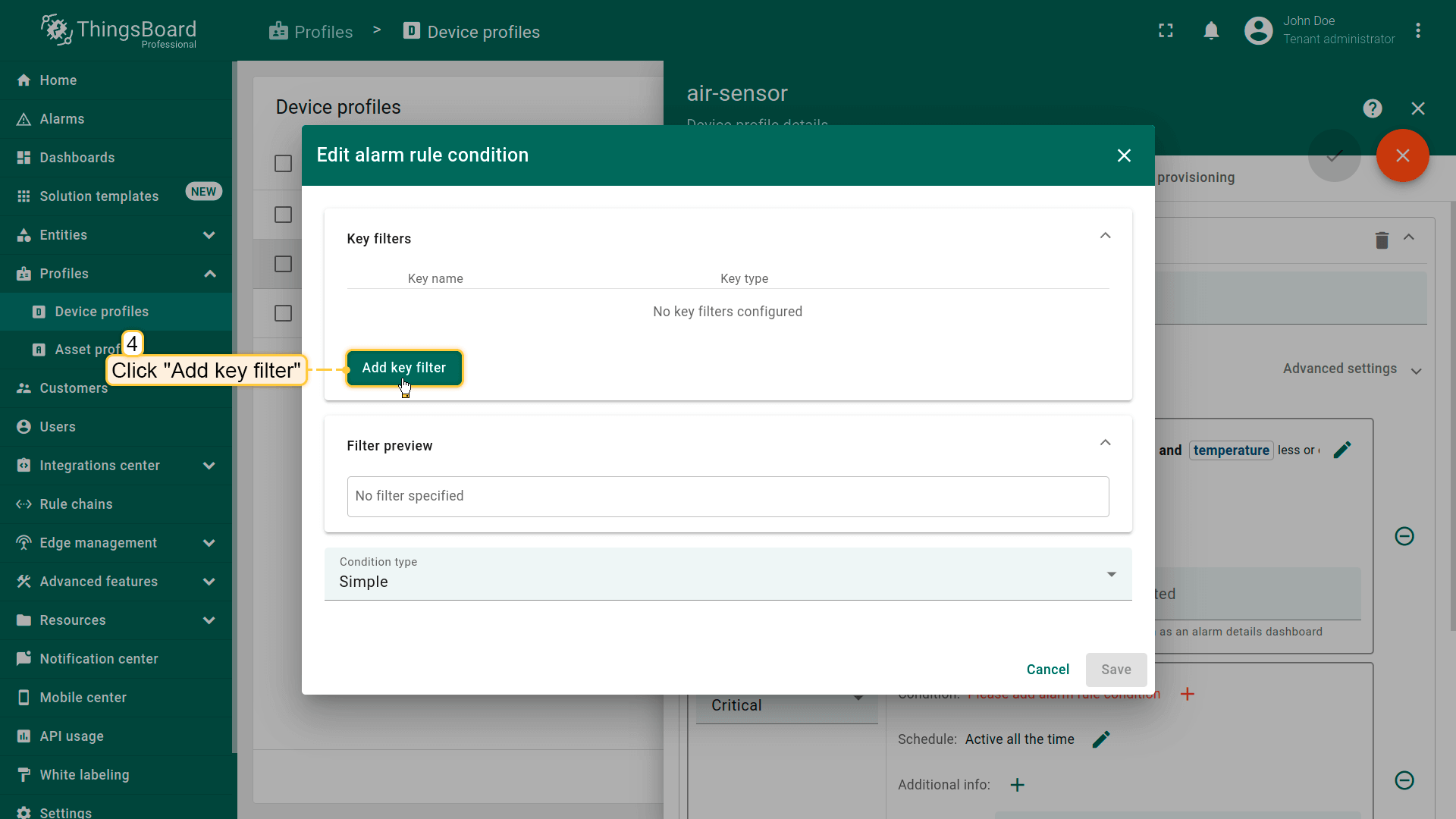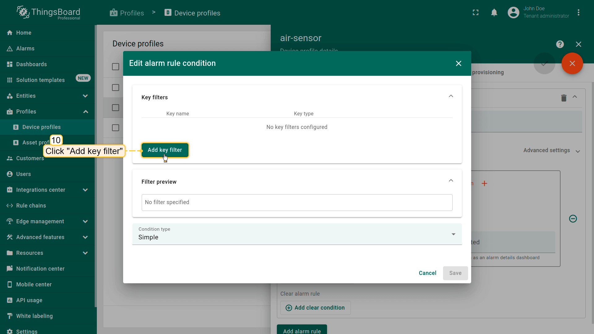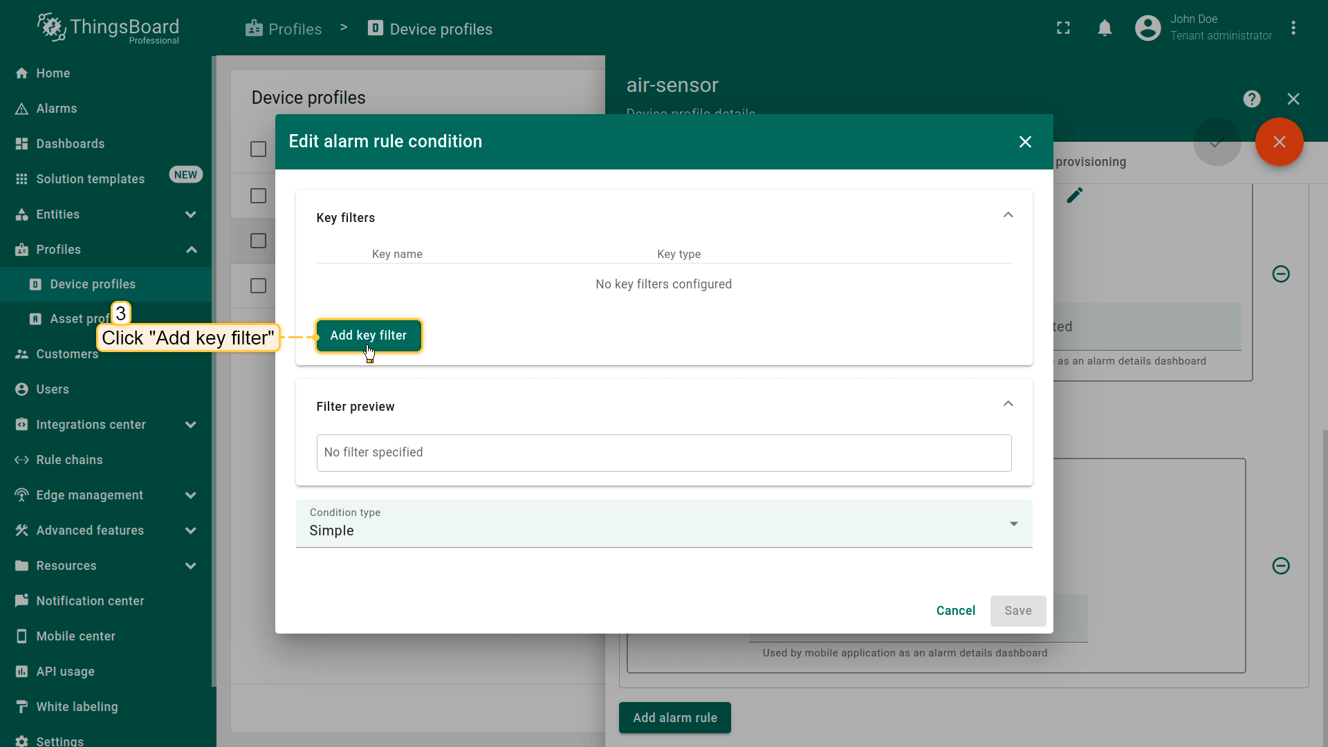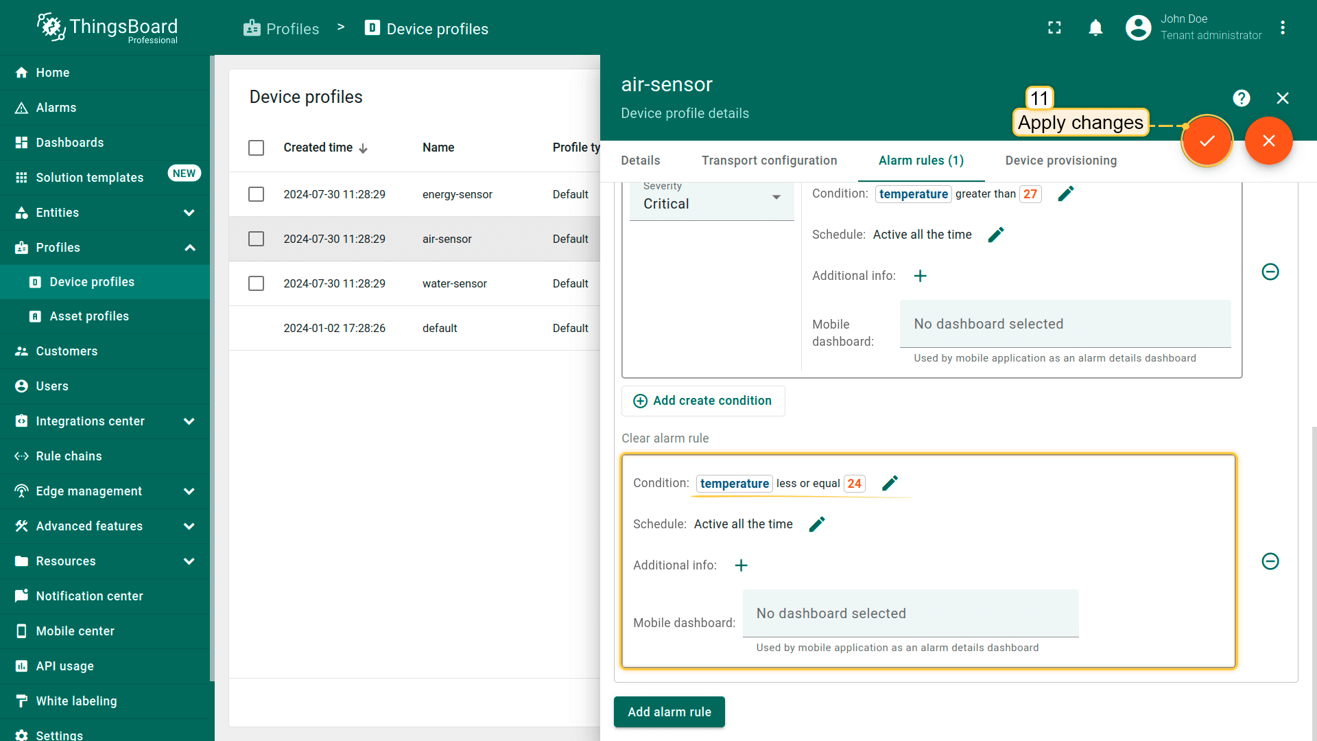 First, you need to define the rules that will trigger the alarm. The simplest way to create the alarm rule is to configure it within the device profile. These rules specify the conditions under which reminders should be generated.