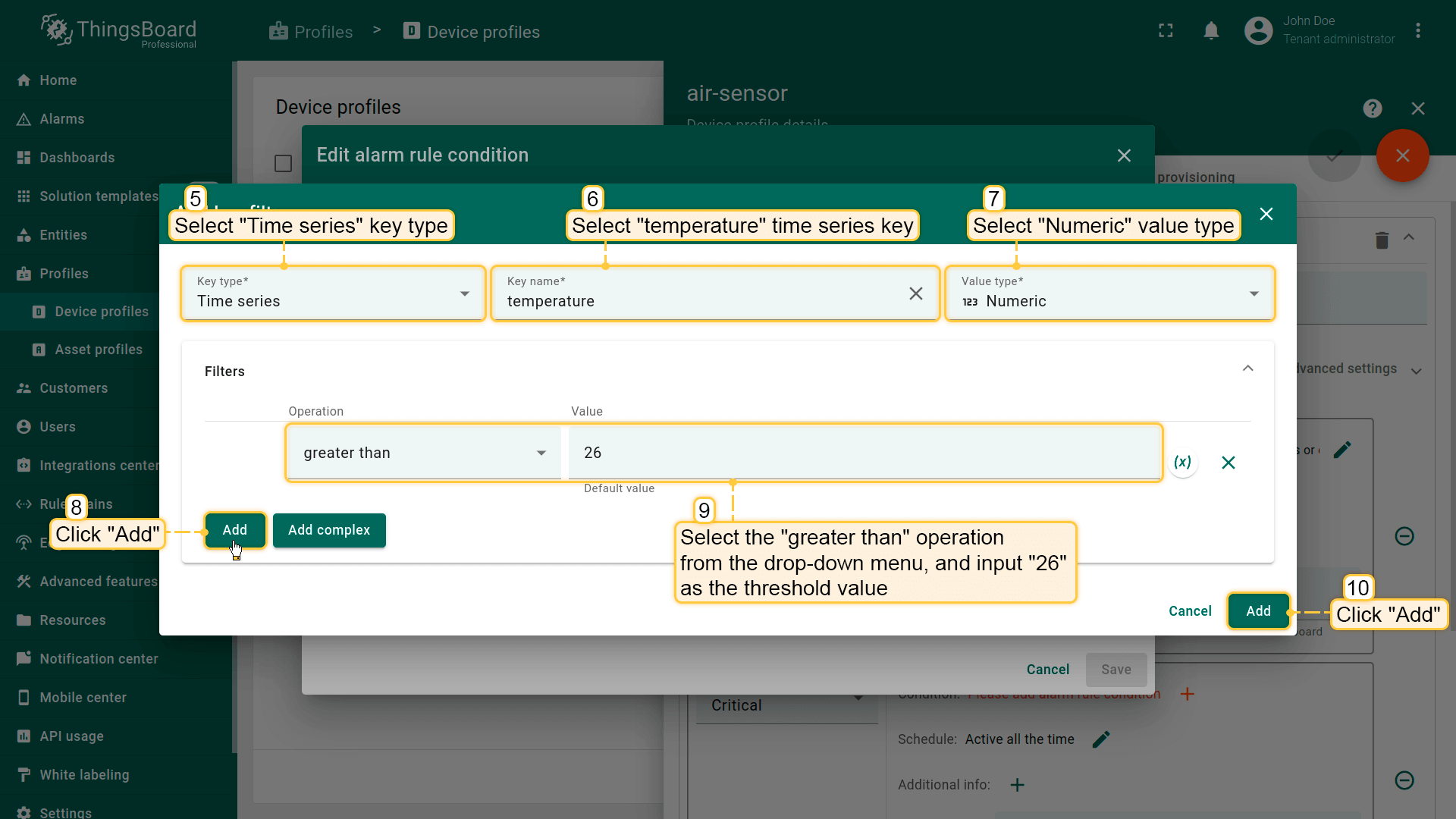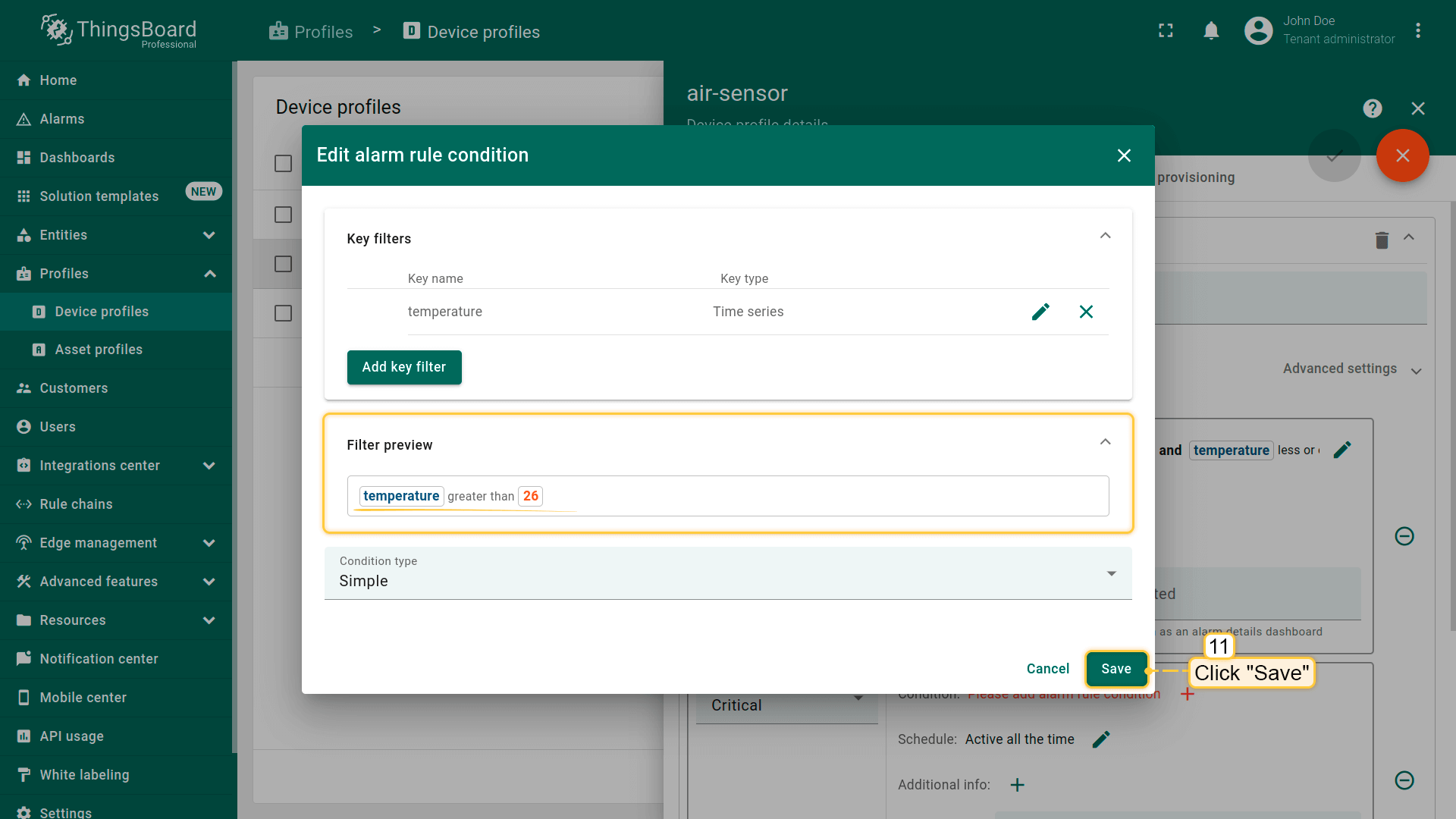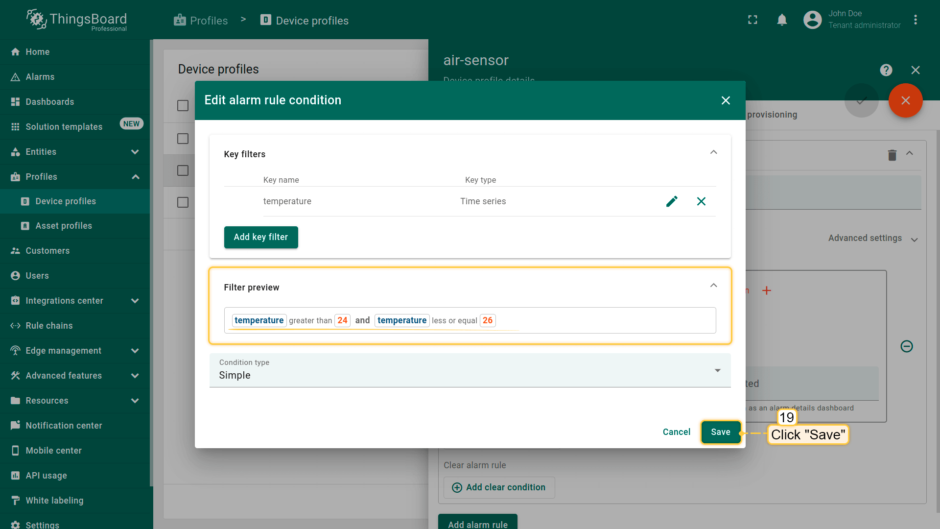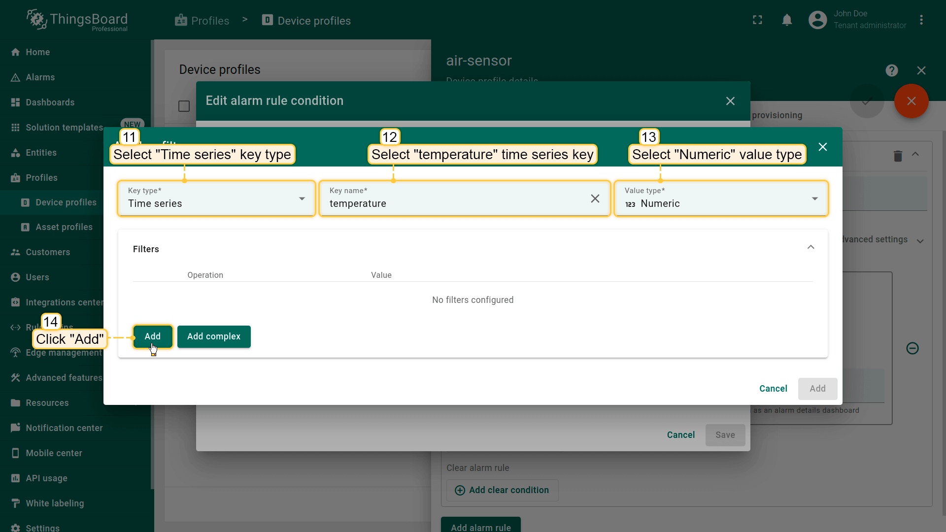 Devices using the air-sensor device profile transmit telemetry data such as temperature, humidity, and CO2 levels. Let's configure alarm rules for each of these telemetry keys: