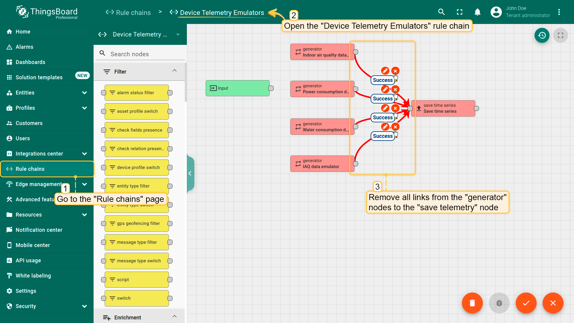 - Go to the “Rule chains” page, and open the “Device Telemetry Emulators” rule chain;