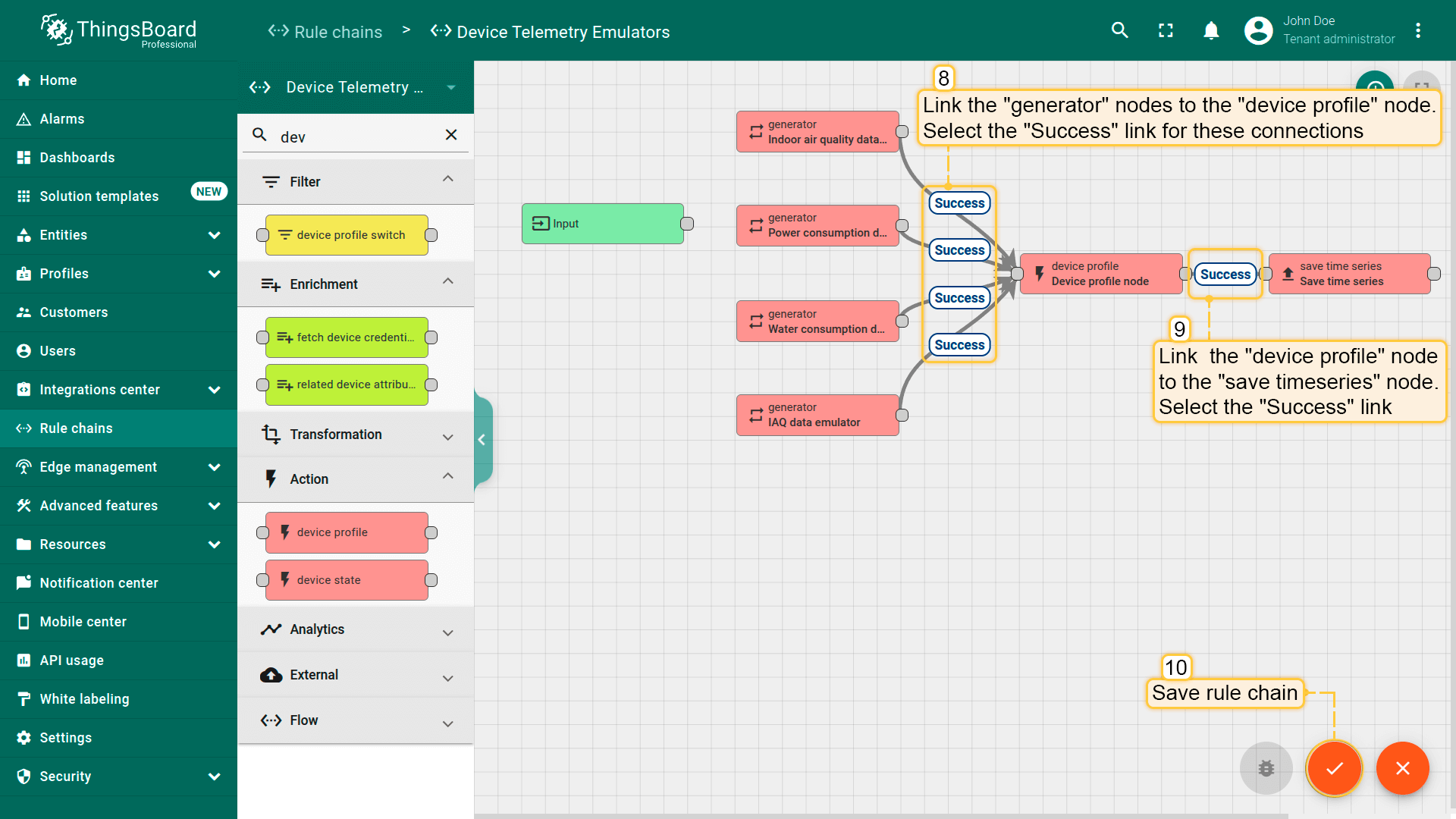 - Connect the “device profile” node to the “save timeseries” node. Again, select the “Success” link;