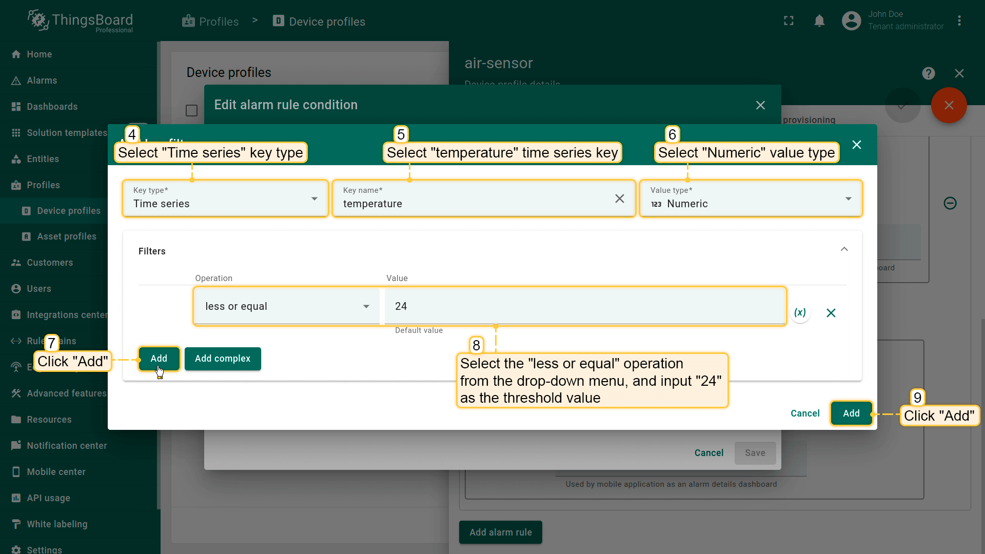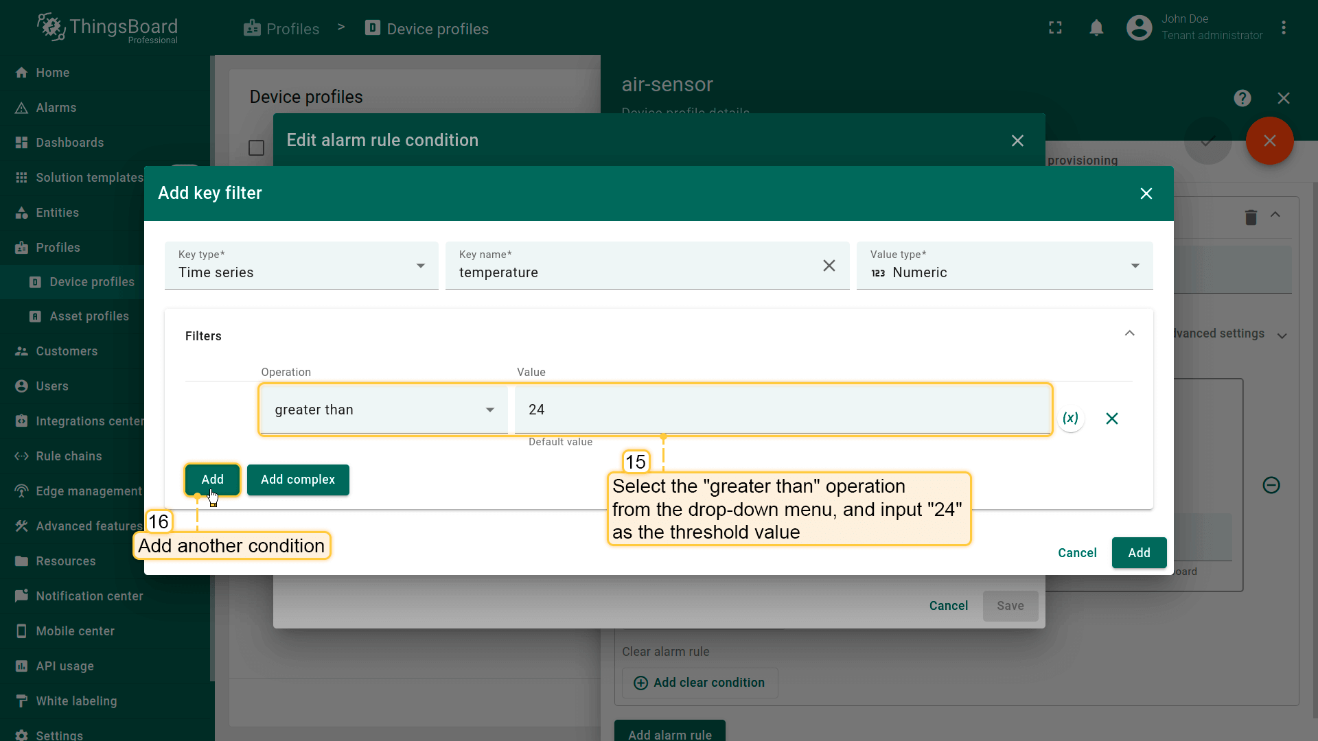 24as the threshold value. Click “Add” to confirm adding key filter; - Click the “Save” button to apply the alarm condition;