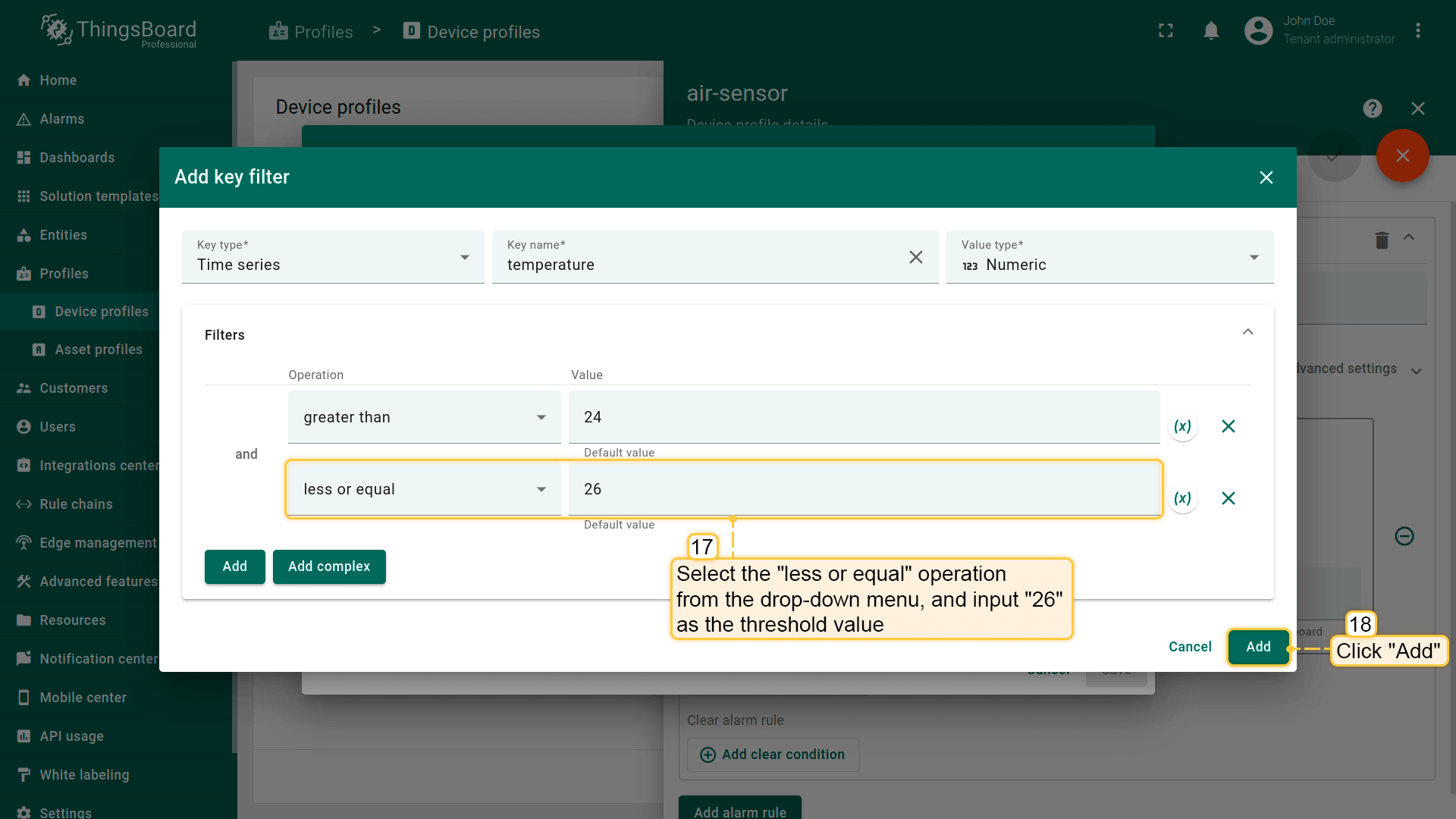 26as the threshold value. Click “Add” to confirm adding key filter; - Click the “Save” button to apply the alarm condition.